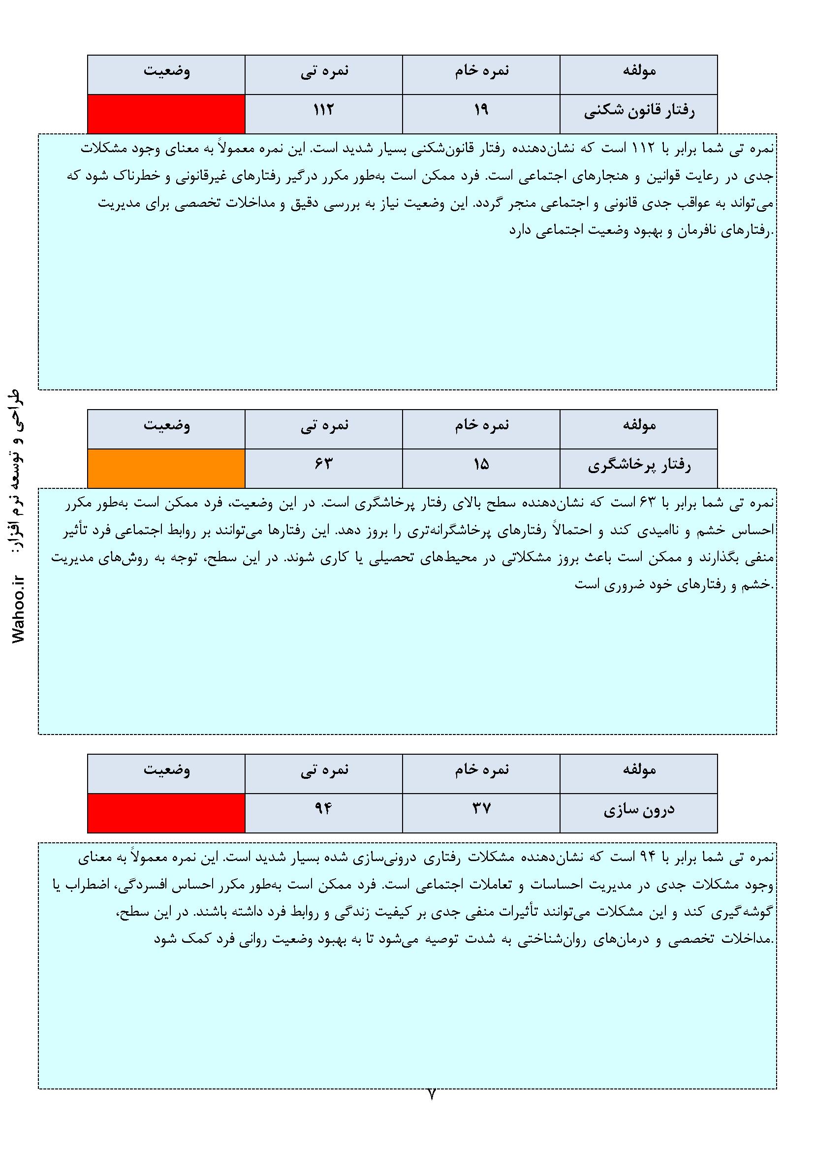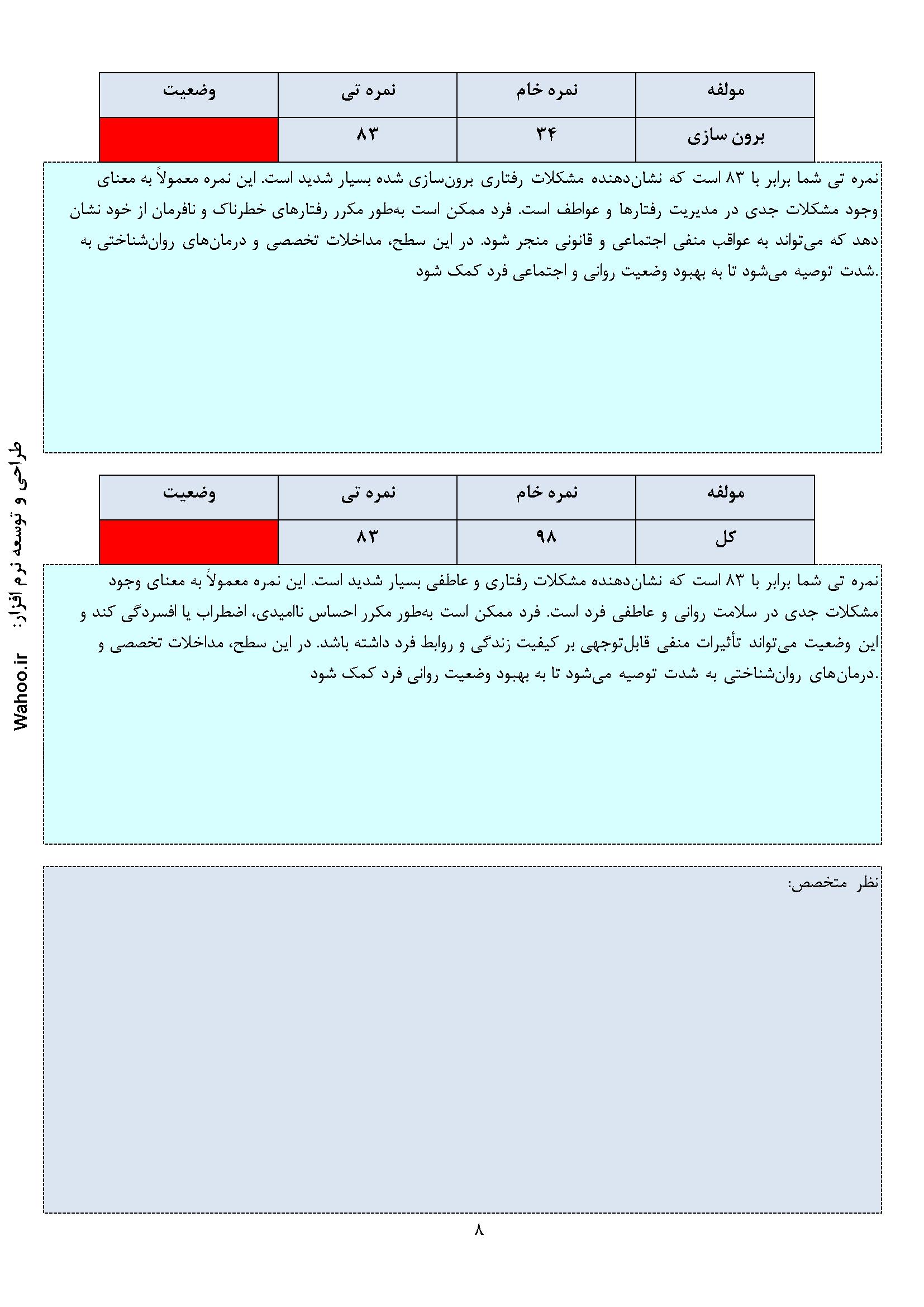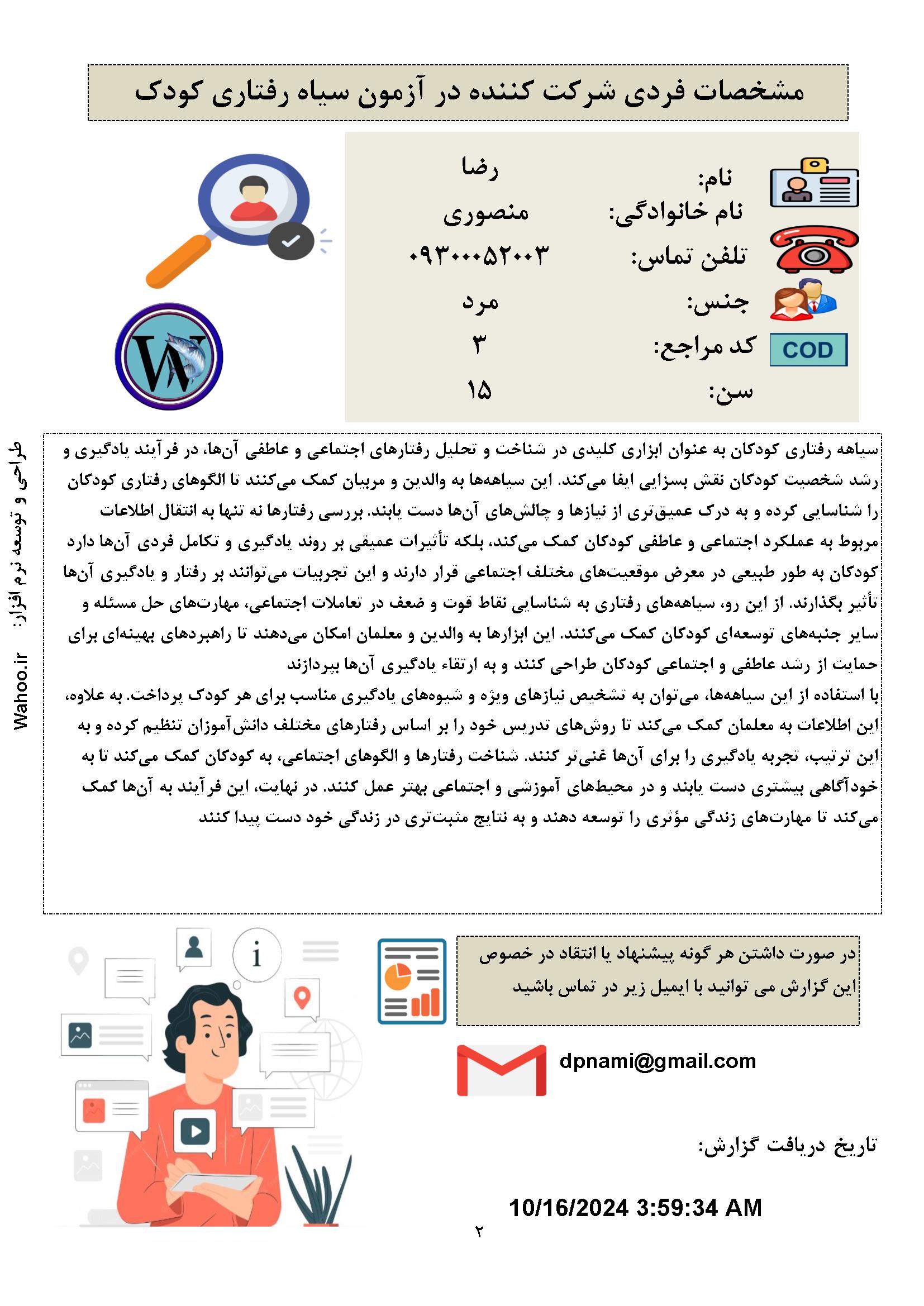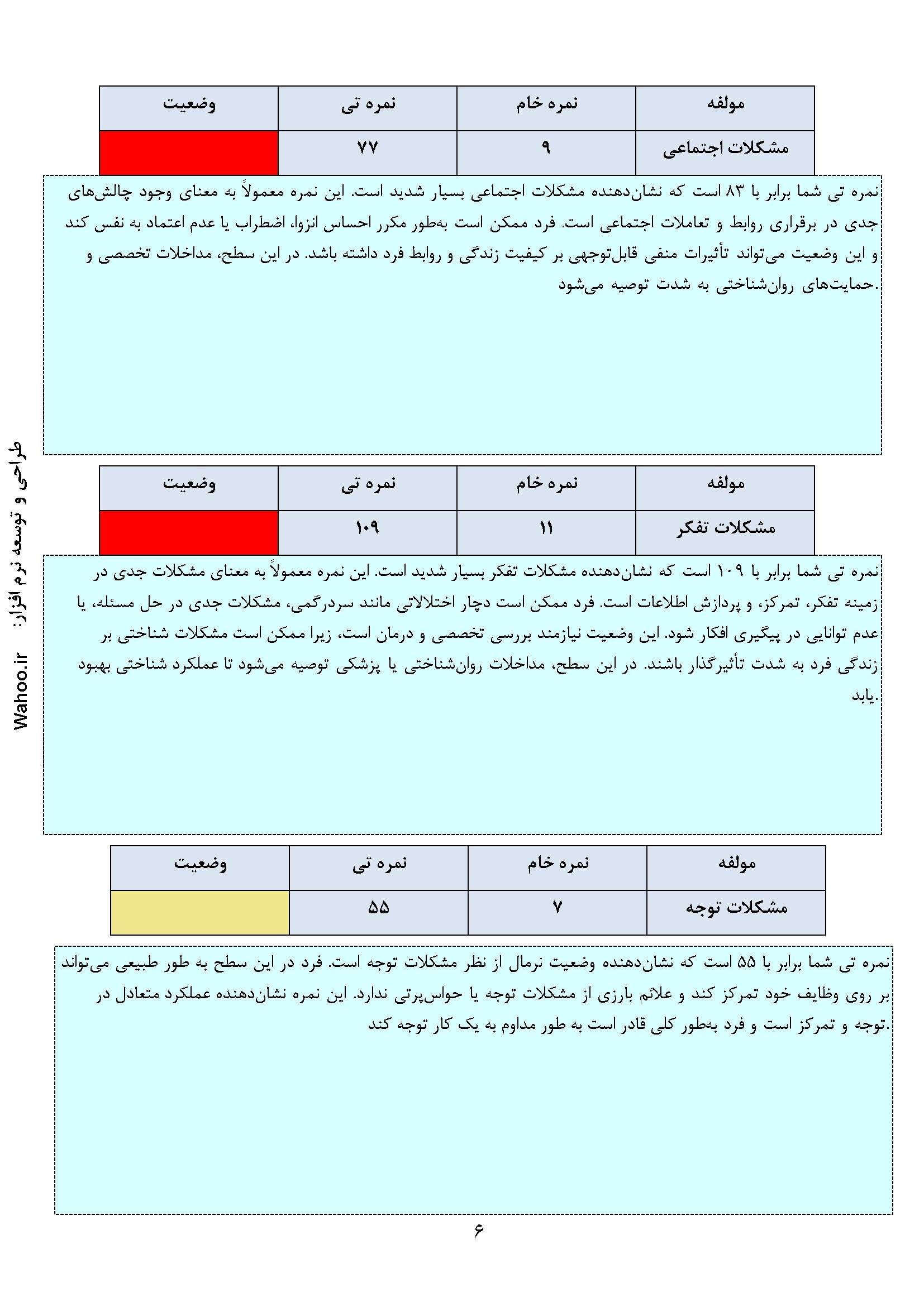 - گزارشهای دقیق و جامع: نتایج به صورت گزارشهای مفصل و قابل فهم ارائه میشوند که شامل تحلیلهای دقیق و نمرات استاندارد شده است. این گزارشها به متخصصان کمک میکند تا یک ارزیابی جامع از وضعیت روانی کودک یا نوجوان داشته باشند.