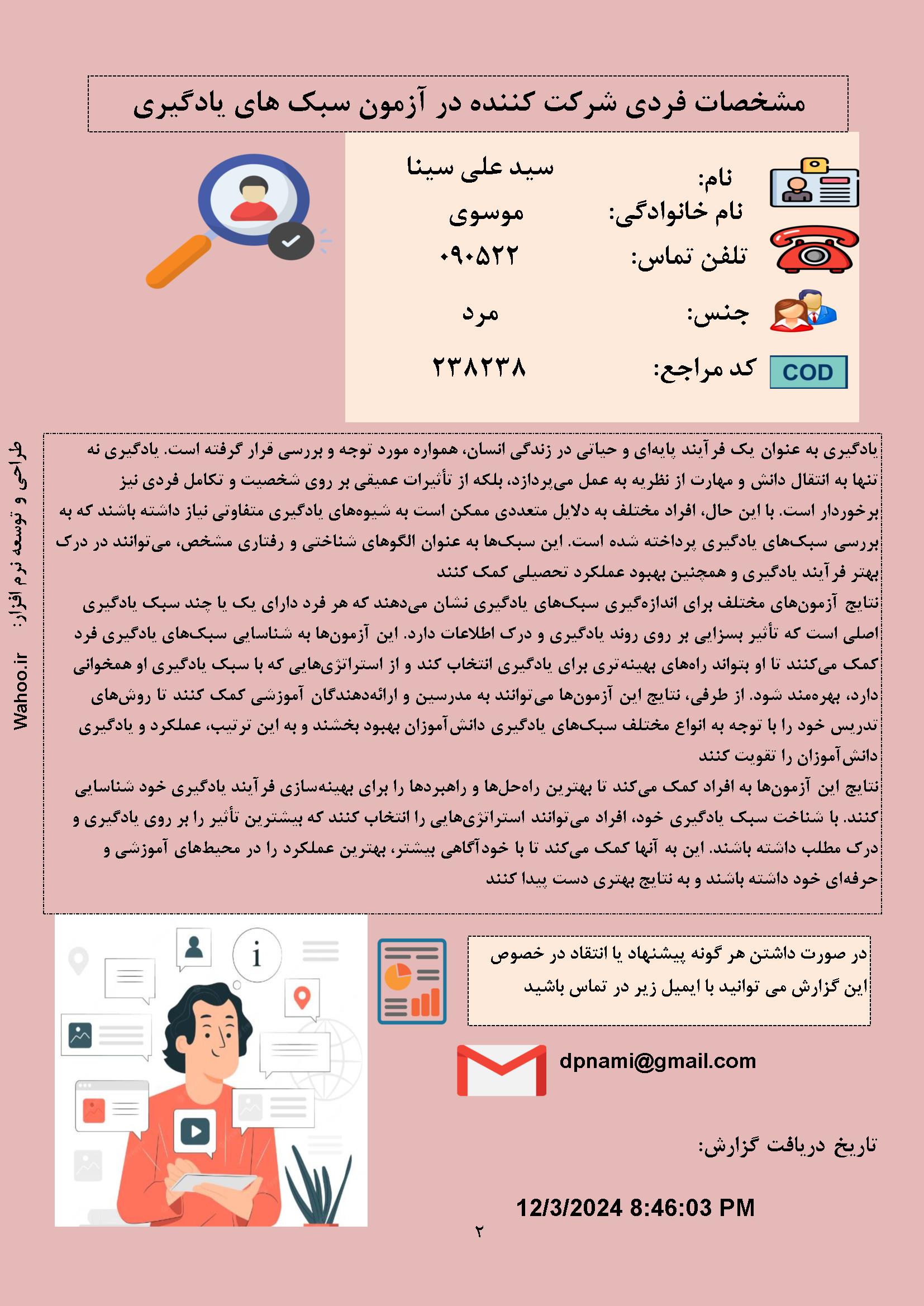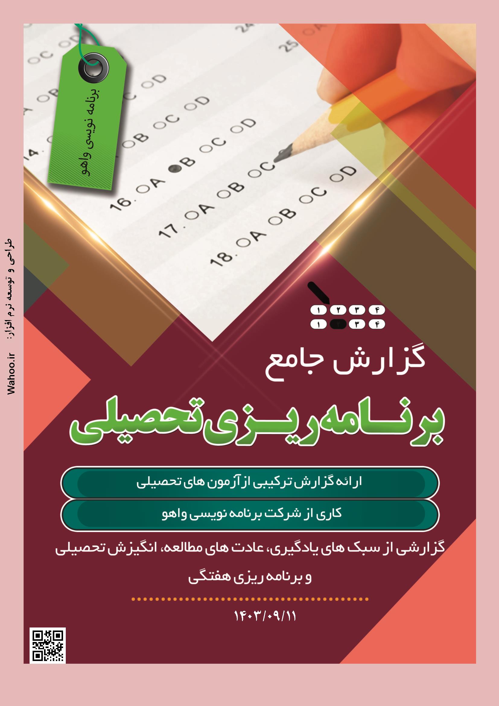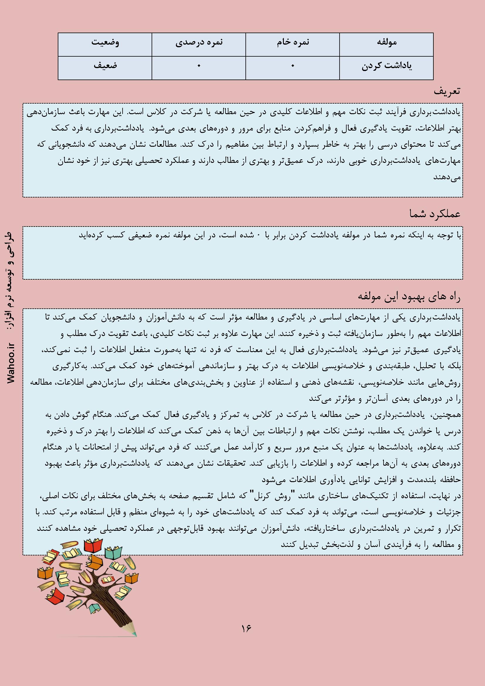 این نرم افزار مخصوص دانش آموزان متوسطه اول و دوم است که به صورت یک کتابچه برای هر فرد ارائه می شود که منحصر به فرد هر شخص است. در این نرم افزار علاوه بر این که قادر هستید نتایج هر آزمون را جداگانه برای هر شخص بگیرید می توانید نتایج چهار آزمون را به صورت ترکیبی در یک گزارش کتابچه ای دریافت کنید که در این کتابچه با در نظر گرفتن سبک یادگیری، عادات مطالعه، انگیزش تحصیلی و برنامه هفتگی یک گزارش منسجم تحصیلی به فرد ارائه می دهد