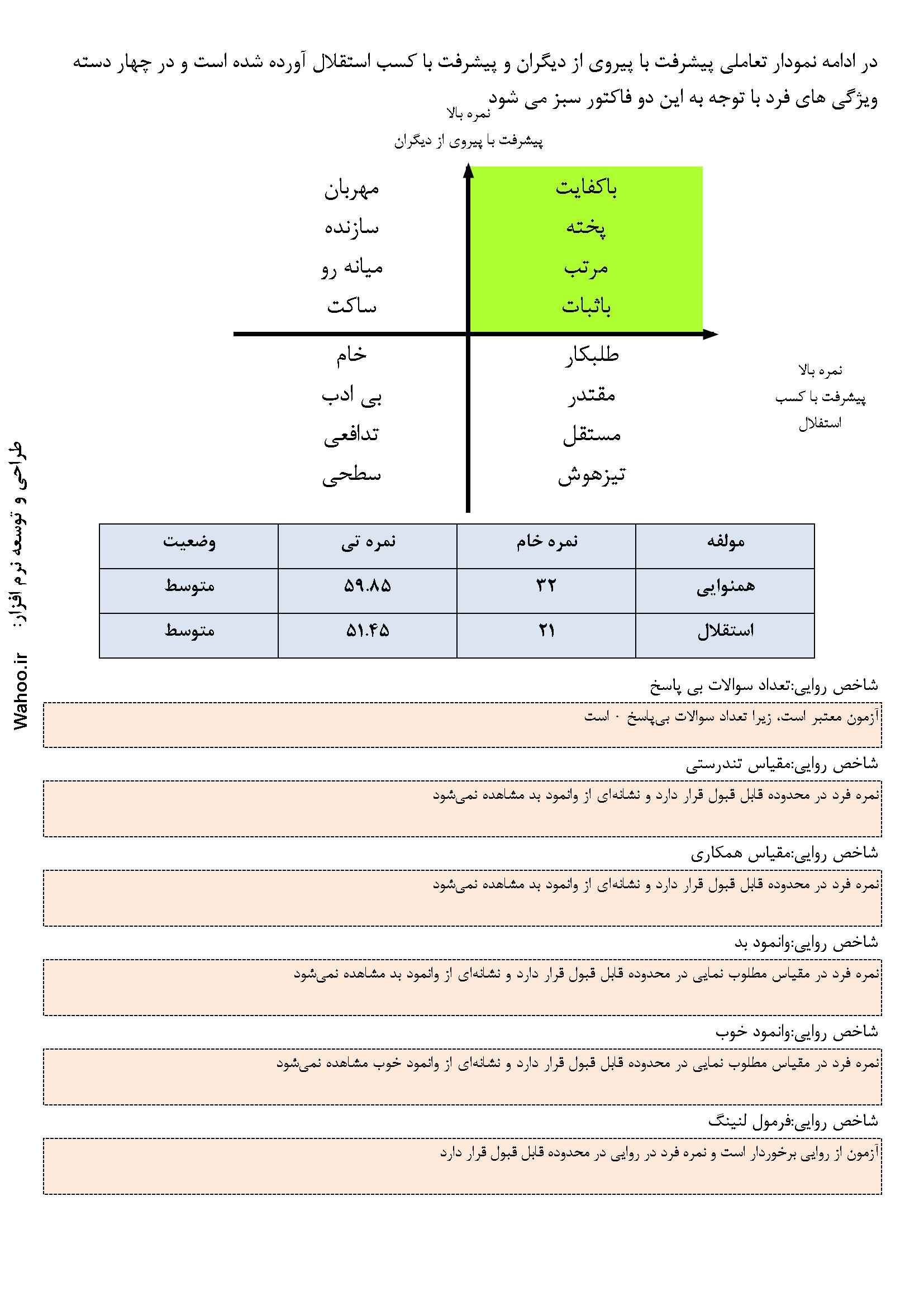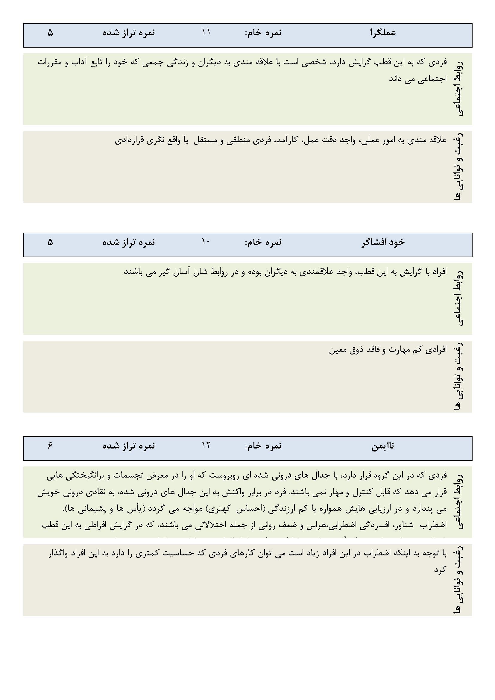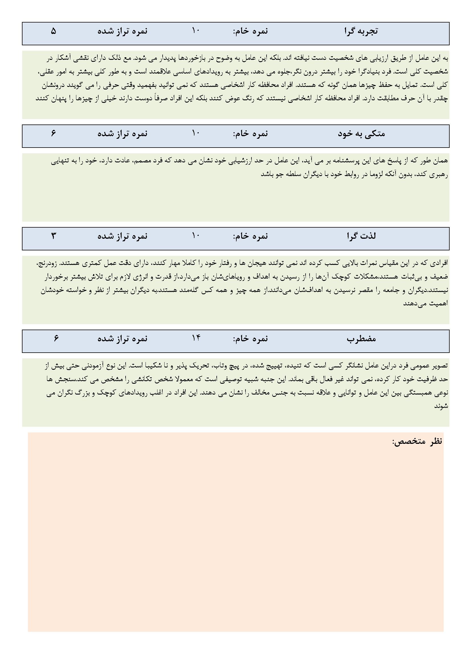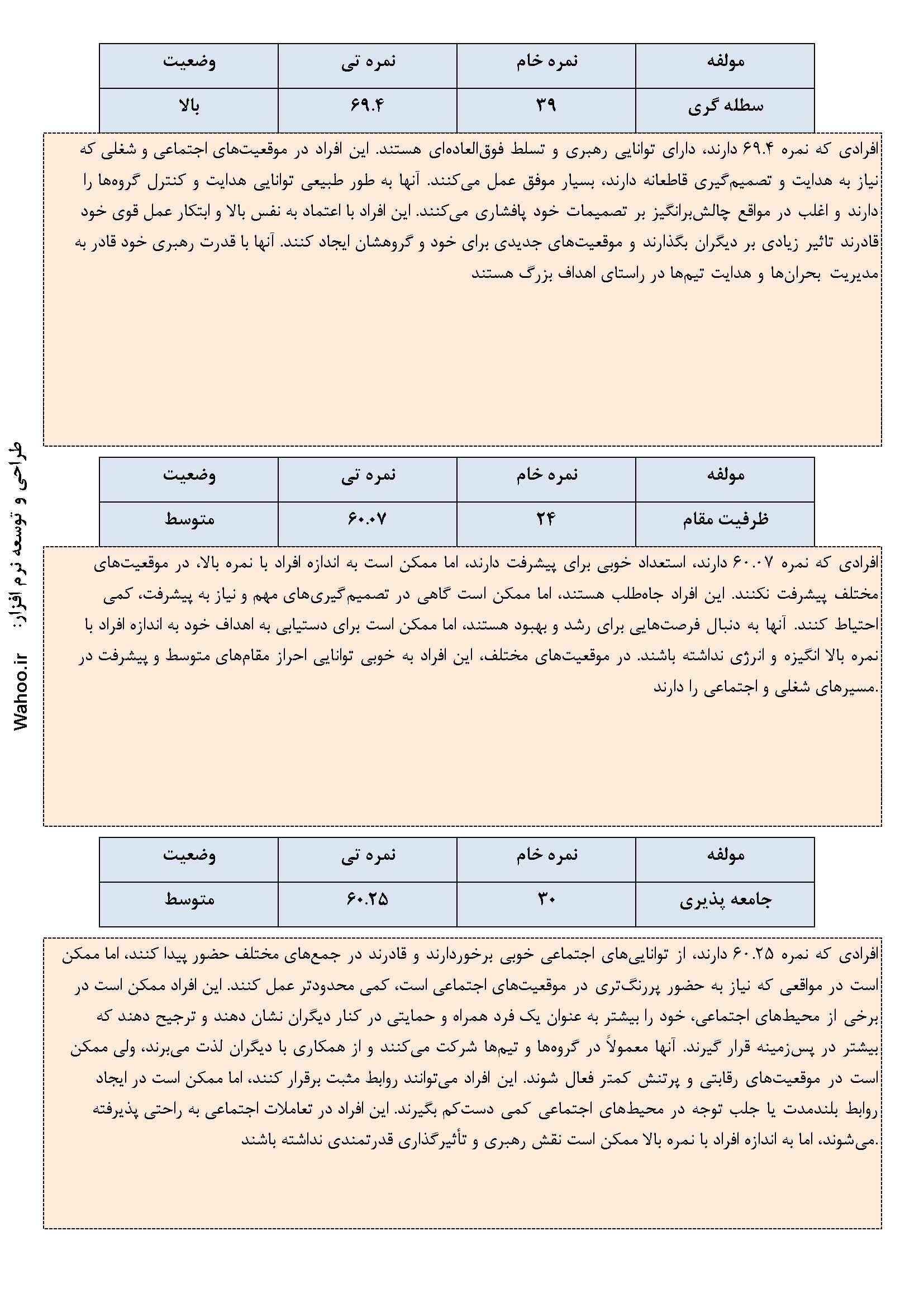 در ادامه نمونه صفحاتی از گزارش نرم‌افزار ارزیابی شخصیت A و B آورده شده است.