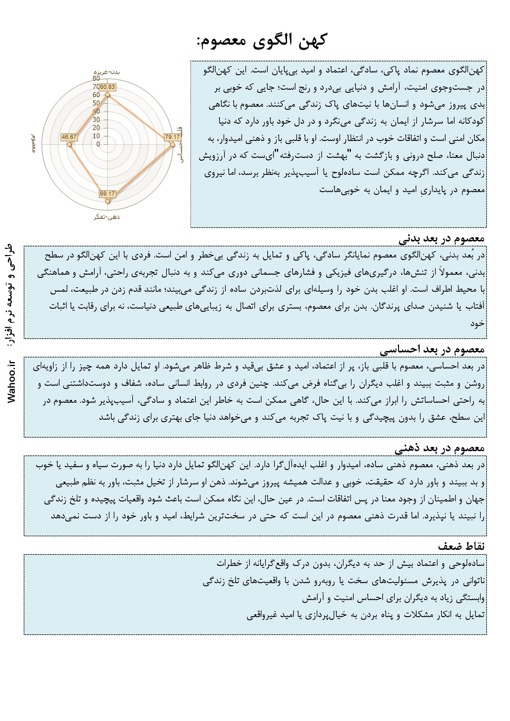 در ادامه نمونه صفحاتی از گزارش از 33 صفحه گزارش نرم افزار کهن الگوها-قهرمان درون آورده شده است.