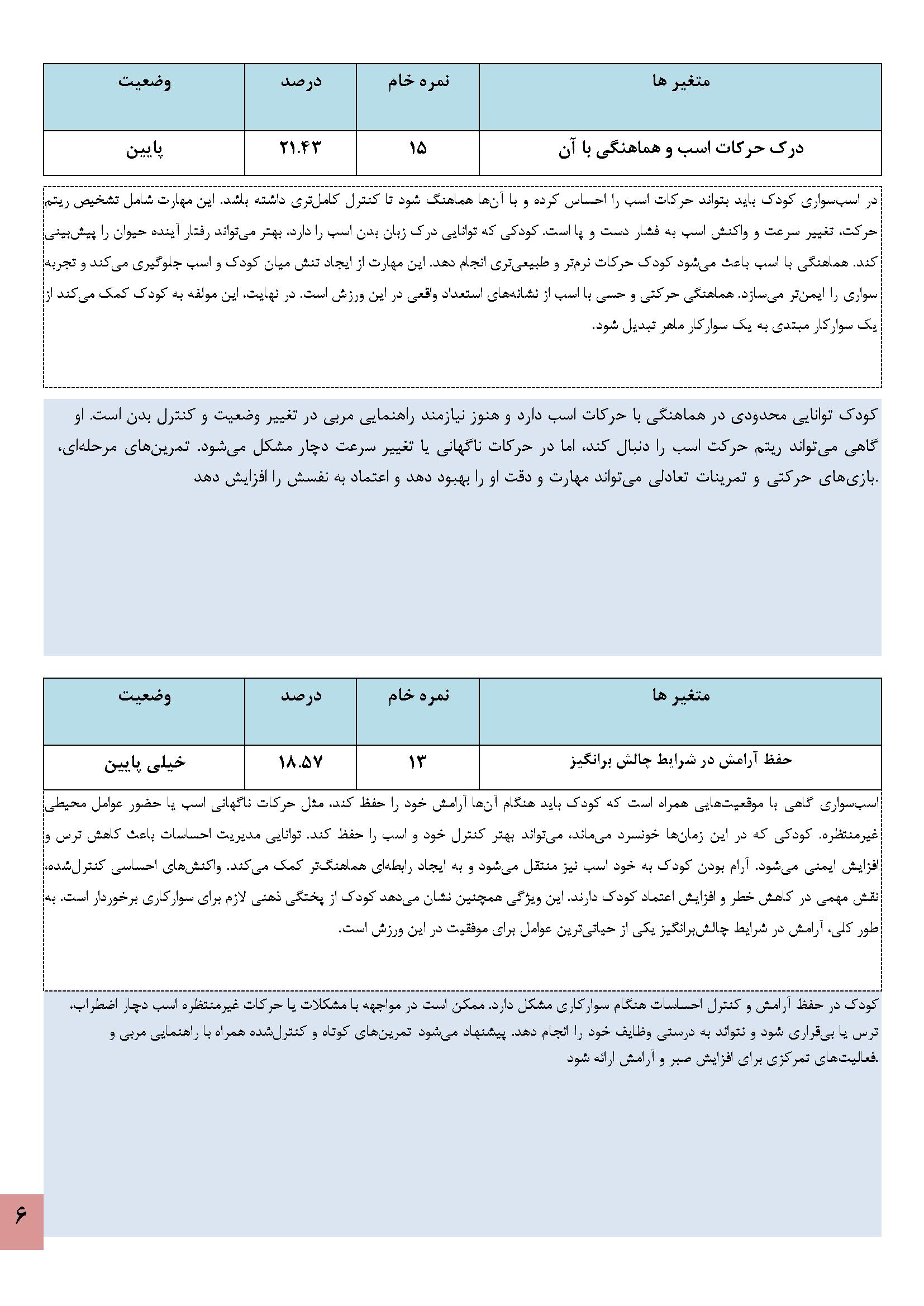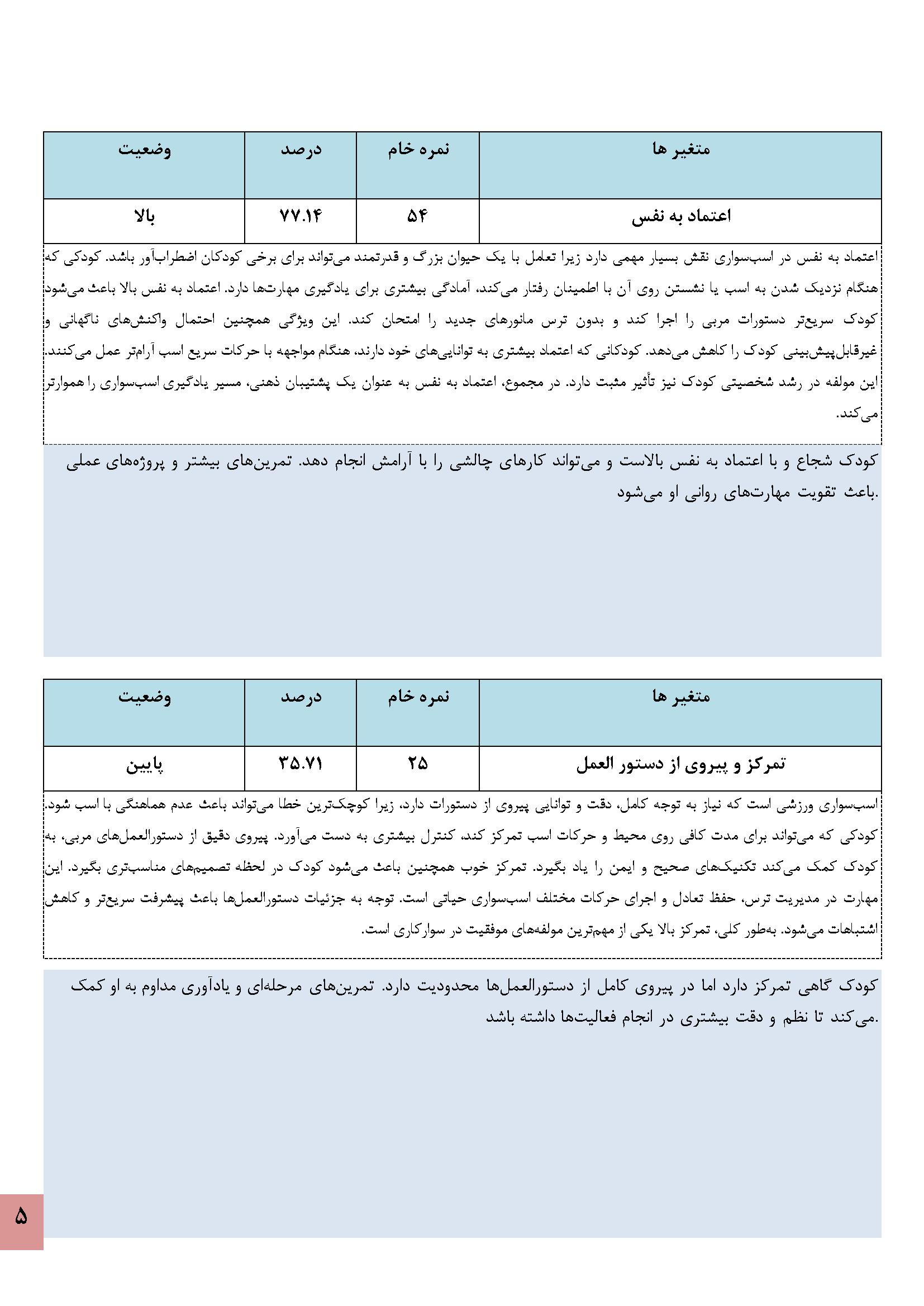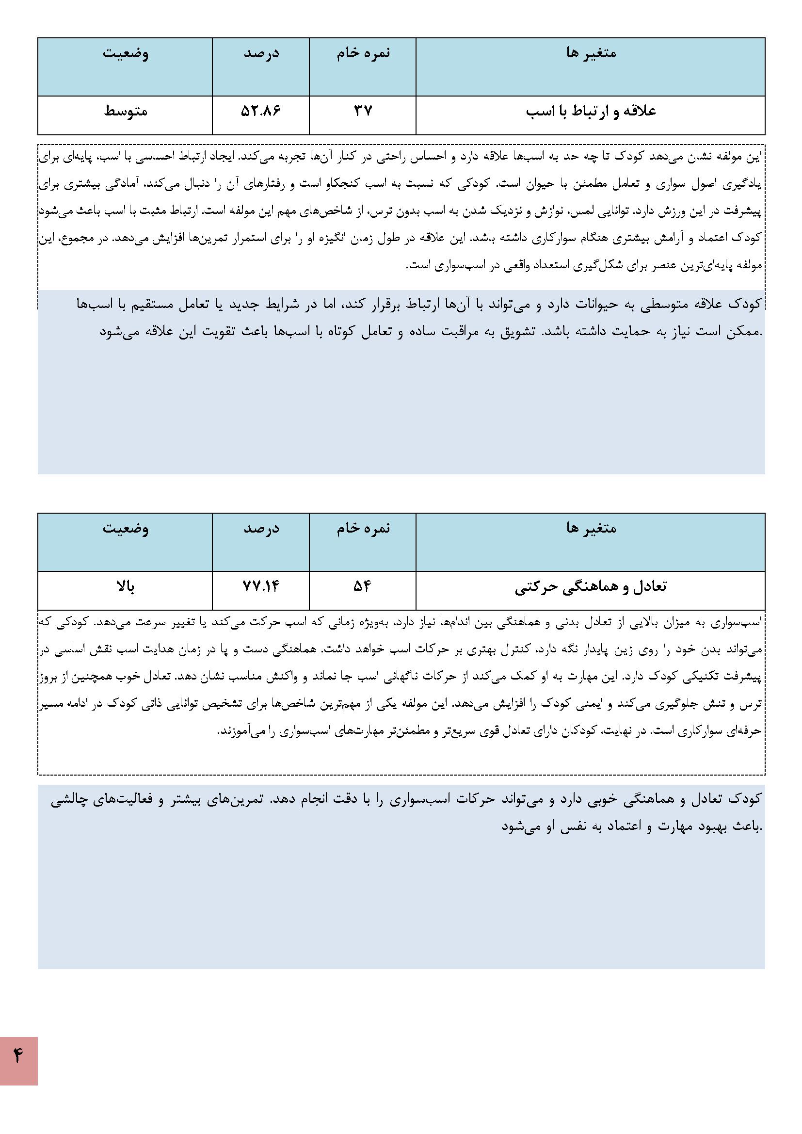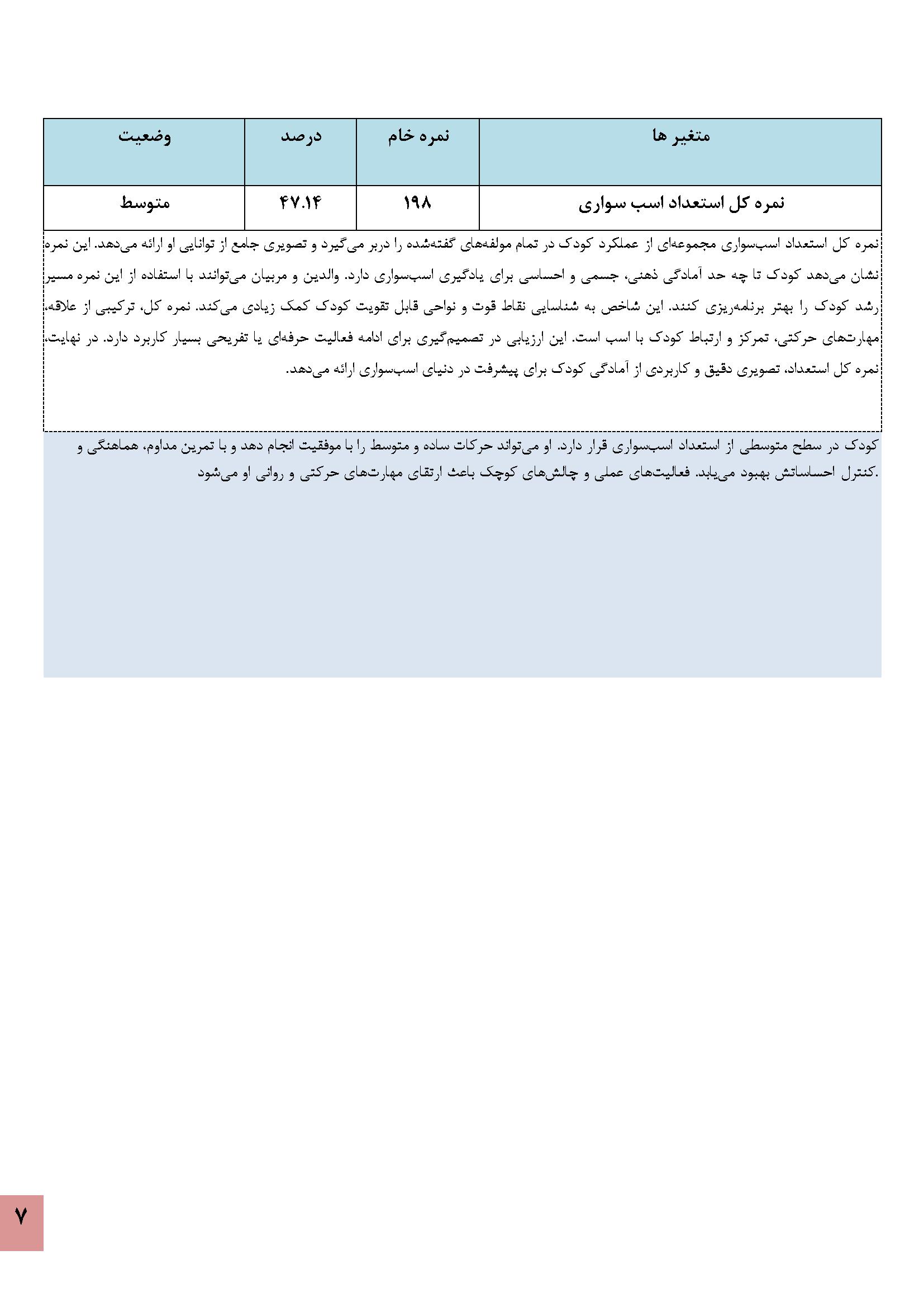 در زیر نمونه خروجی نرمافزار استعدادیابی اسب سواری کودکان آورده شده است