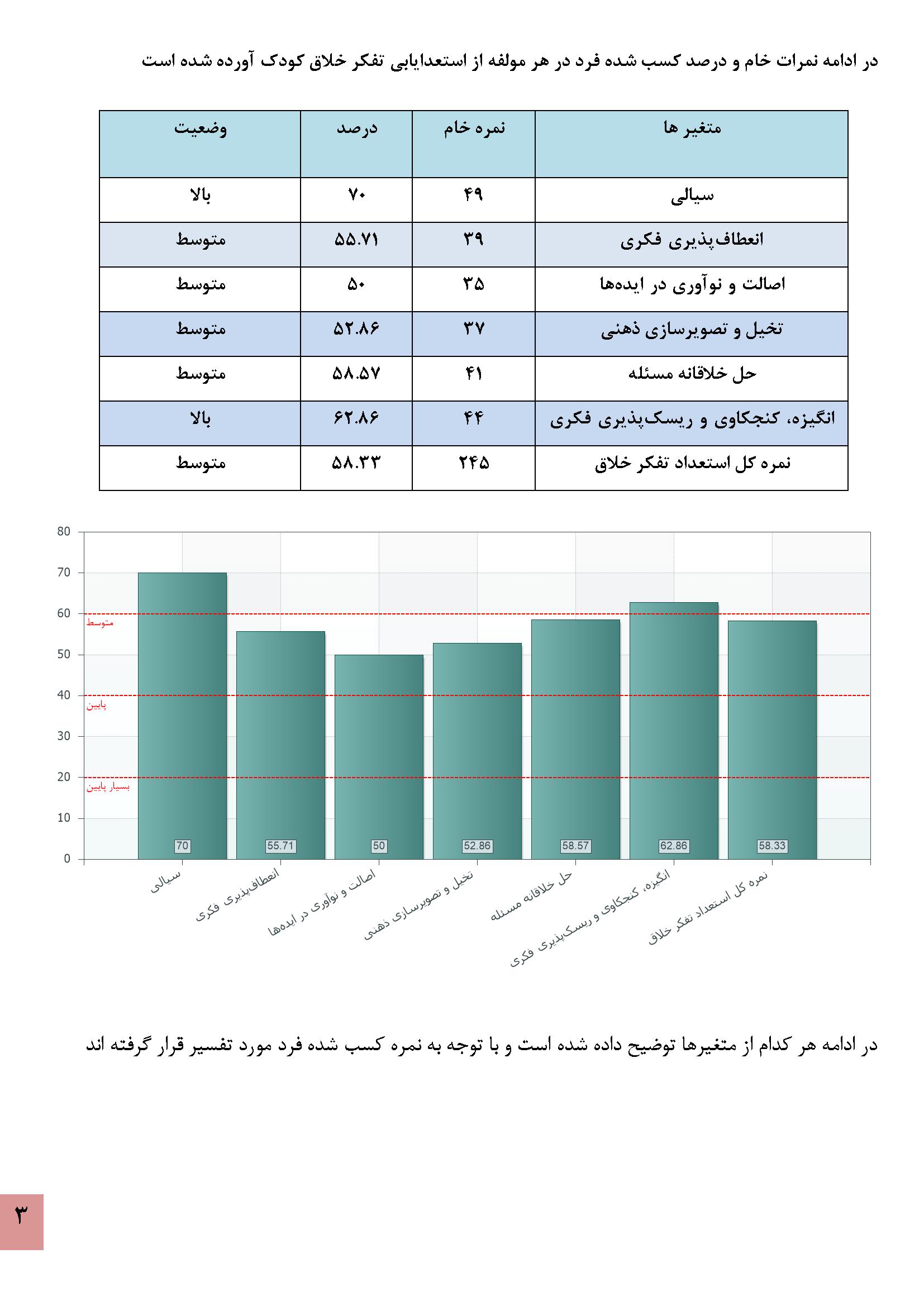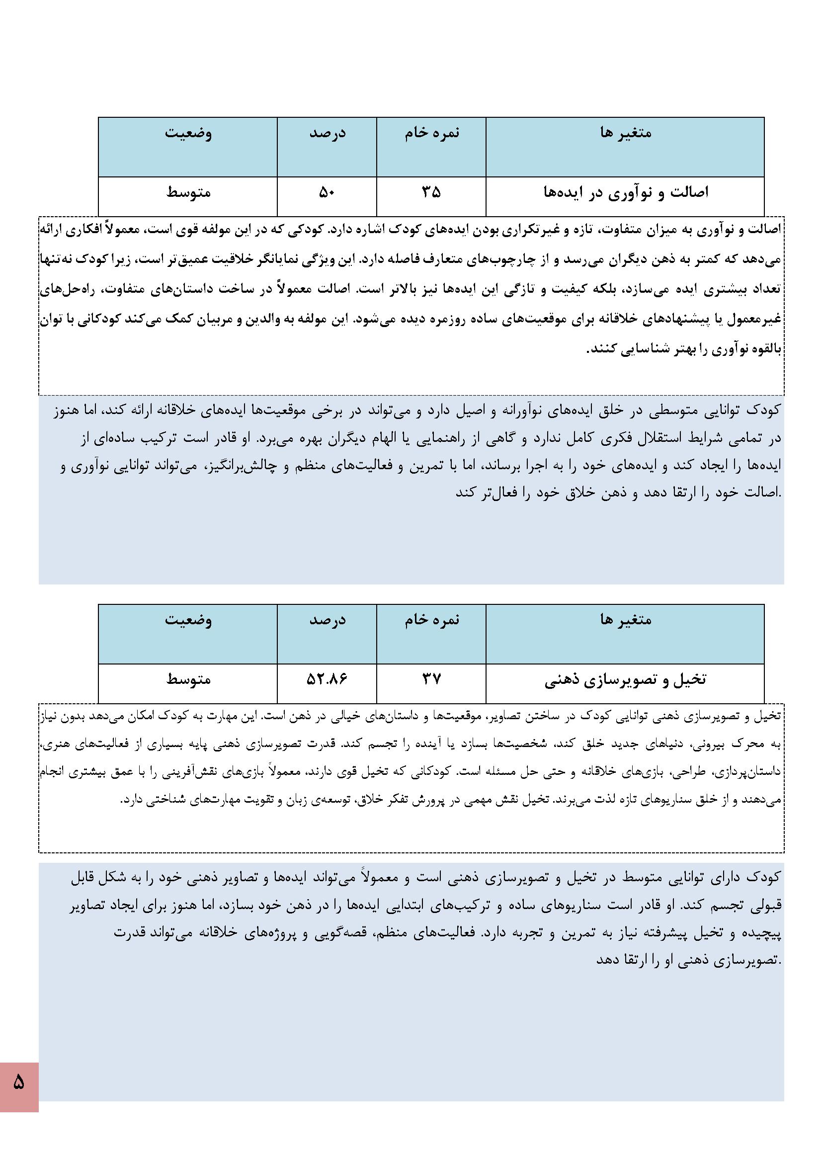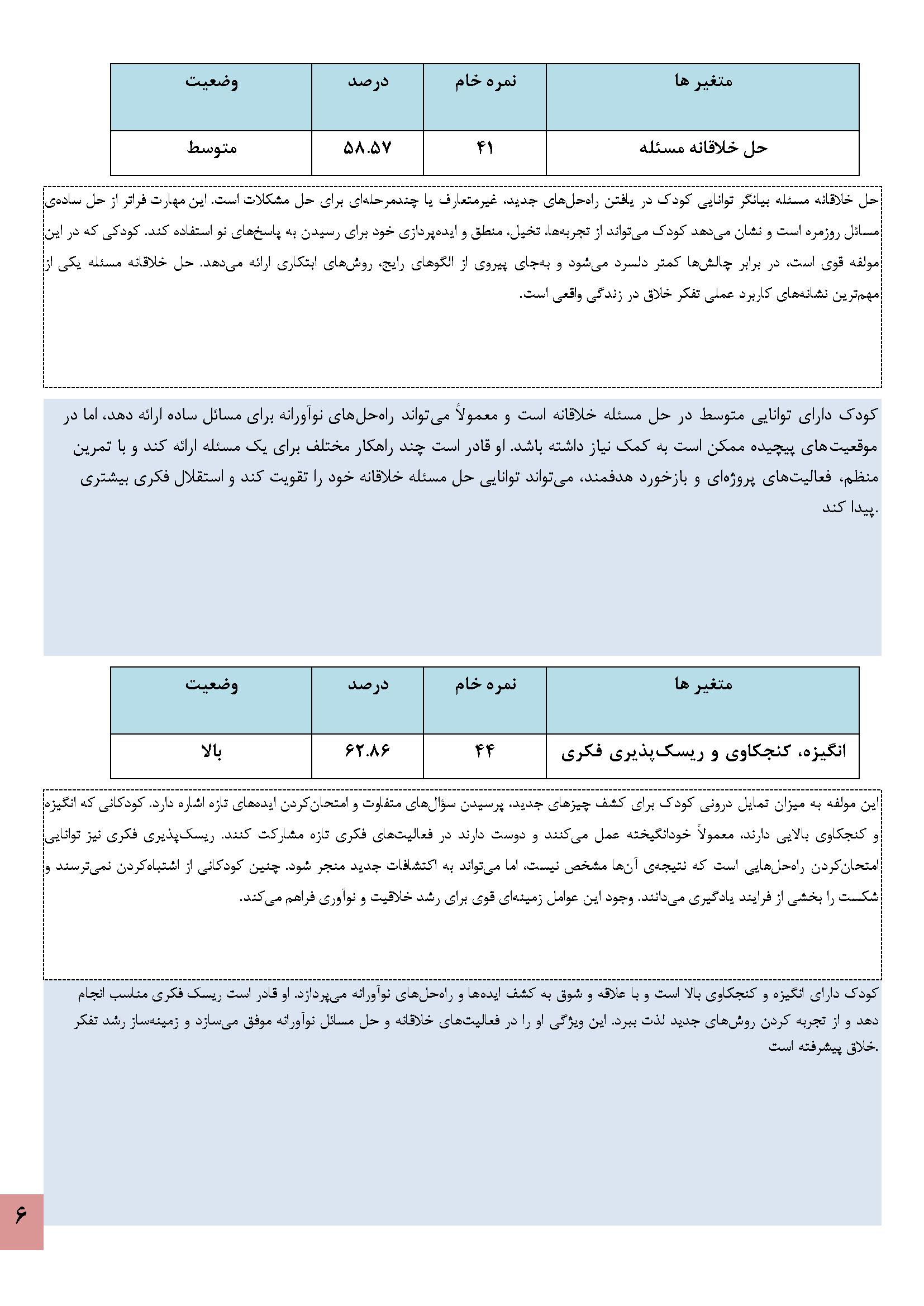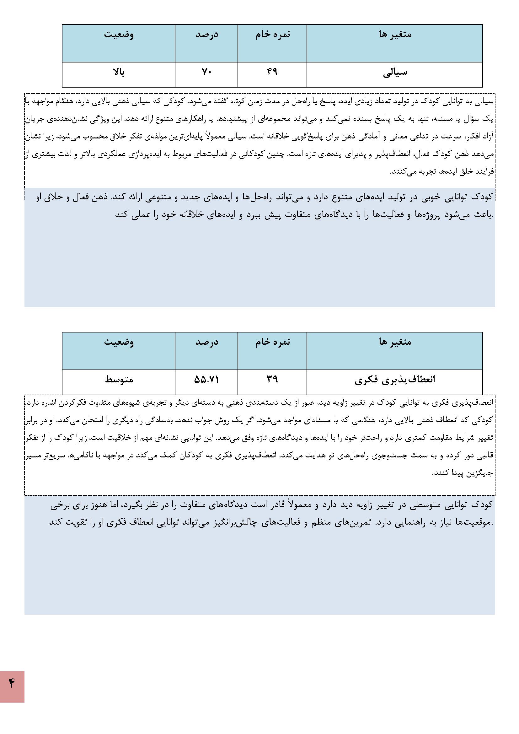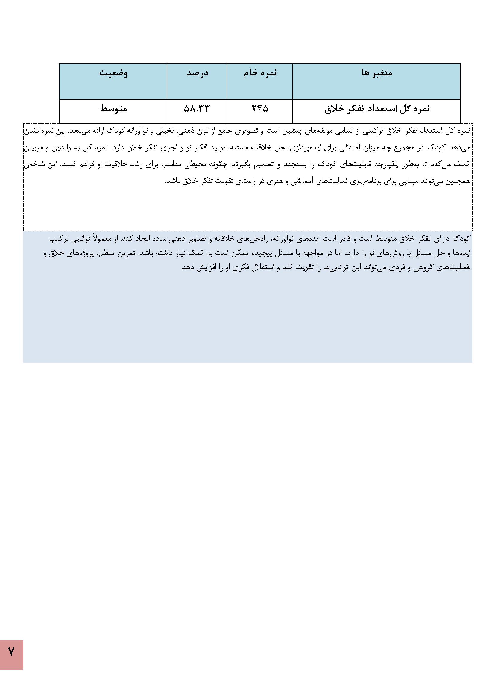 در زیر نمونه خروجی نرمافزار استعدادیابی تفکر خلاق کودکان آورده شده است
