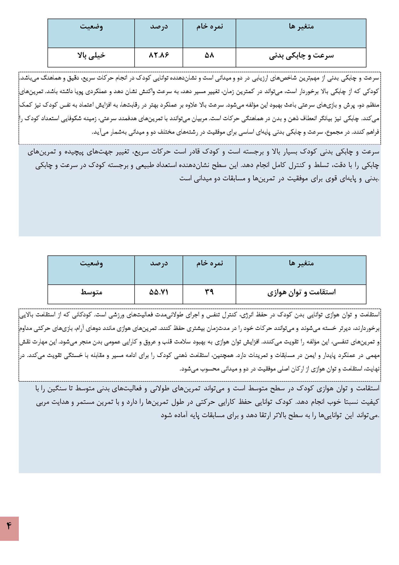 سنجش توان کودک در اجرای حرکات سریع، تغییر جهت، دو سرعت و واکنش سریع به شرایط مختلف در طول تمرین و مسابقه.