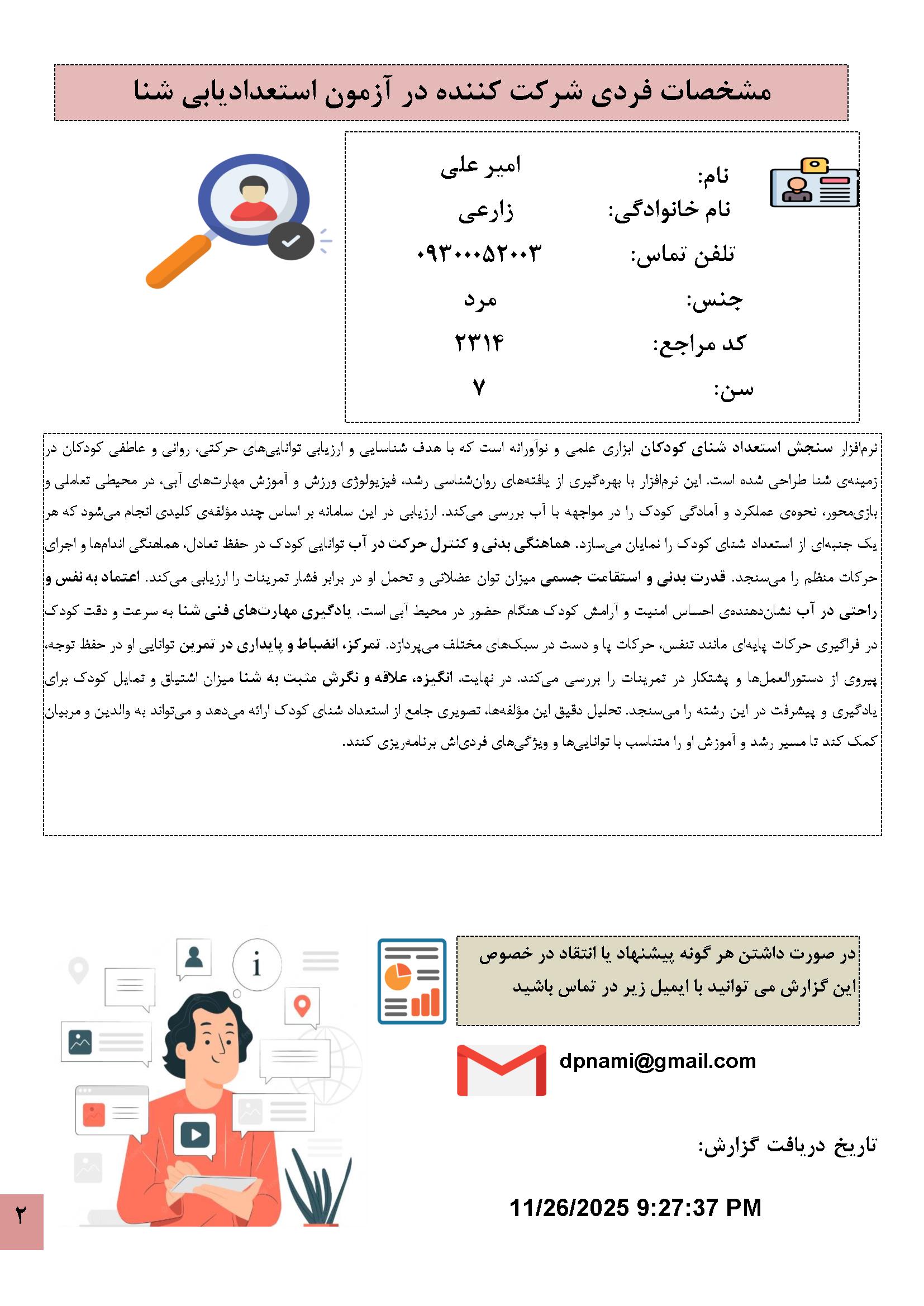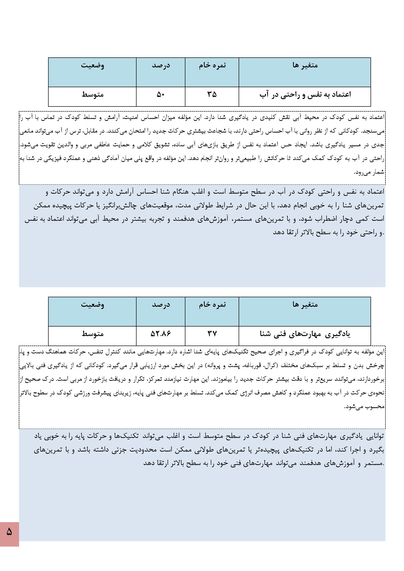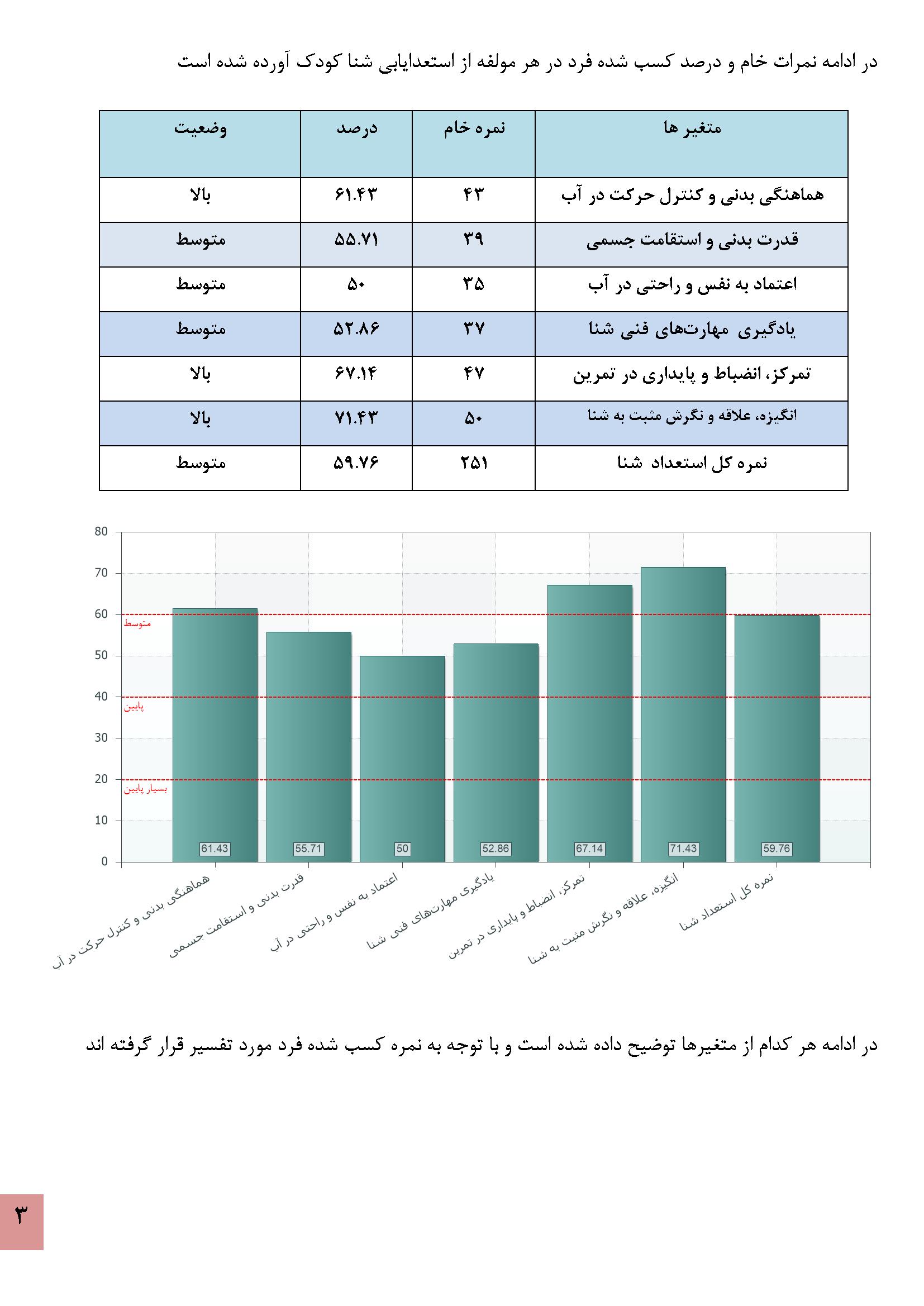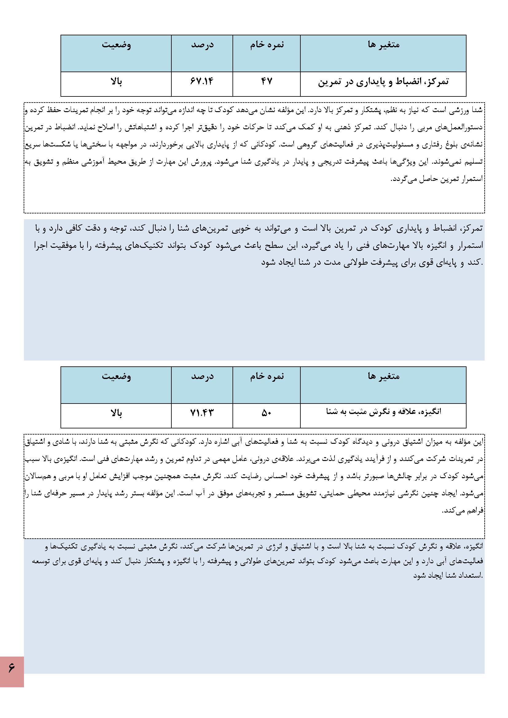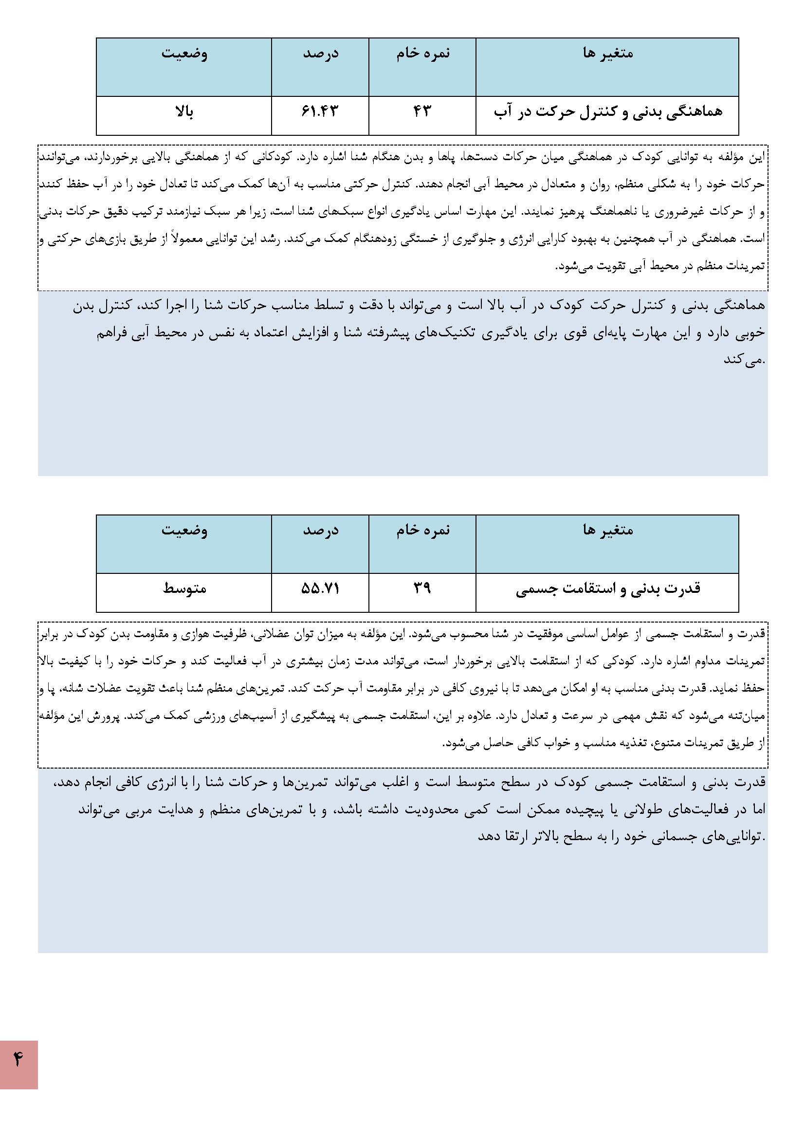 در زیر نمونه خروجی نرمافزار استعدادیابی شنا کودکان آورده شده است