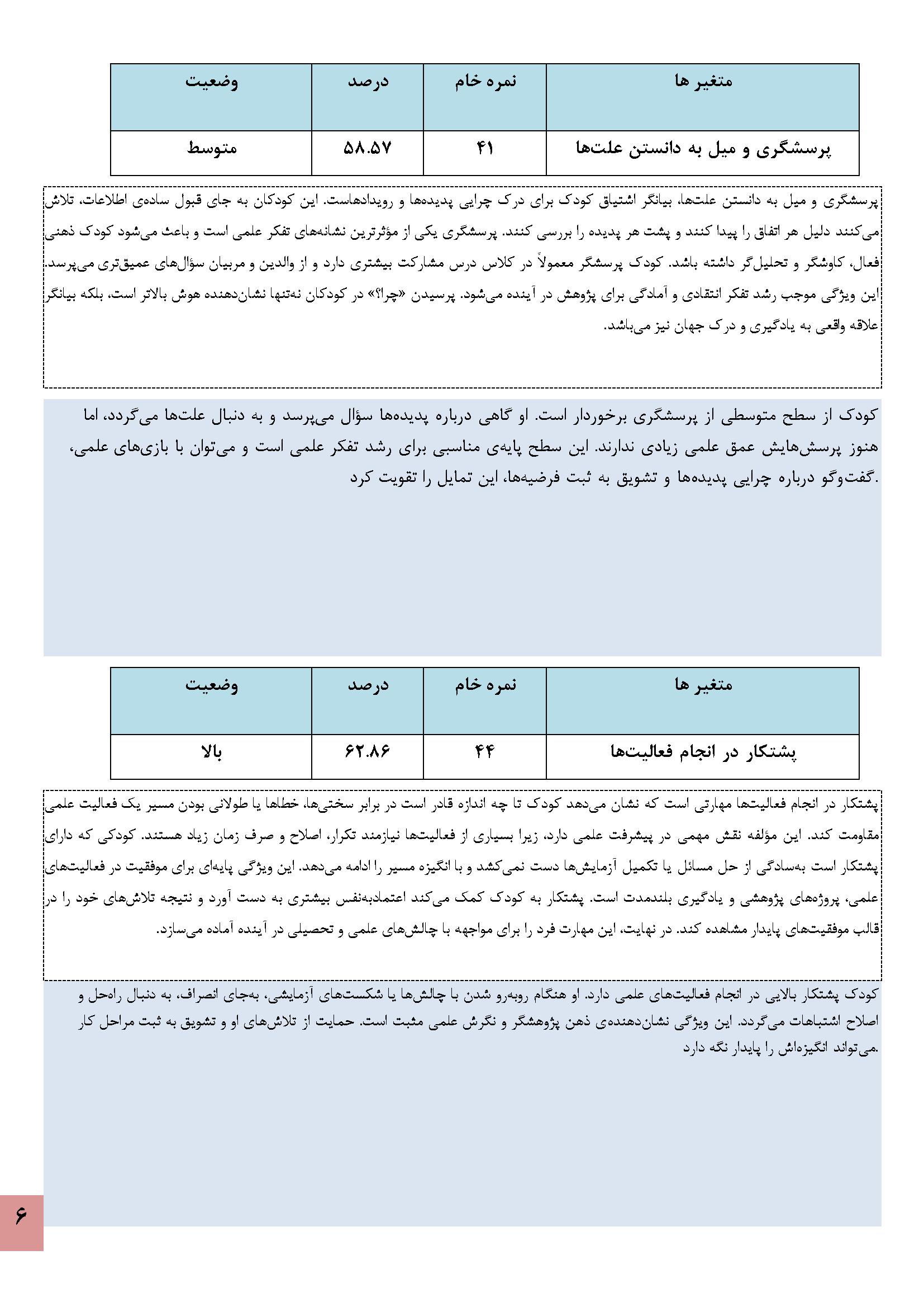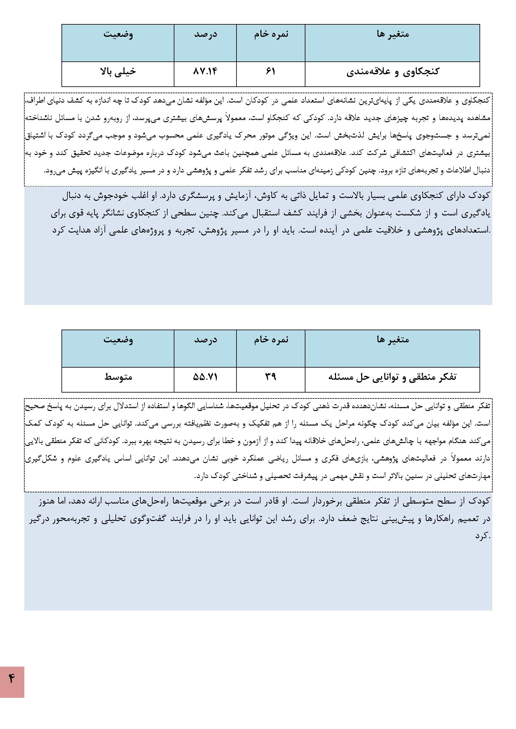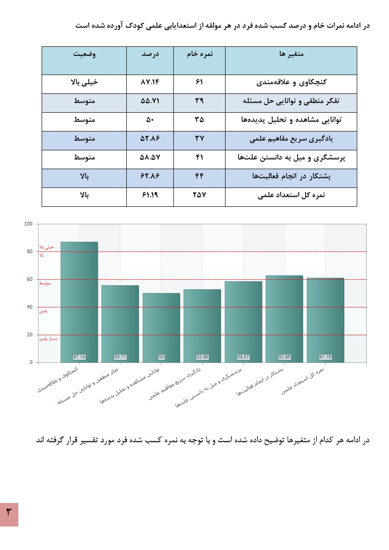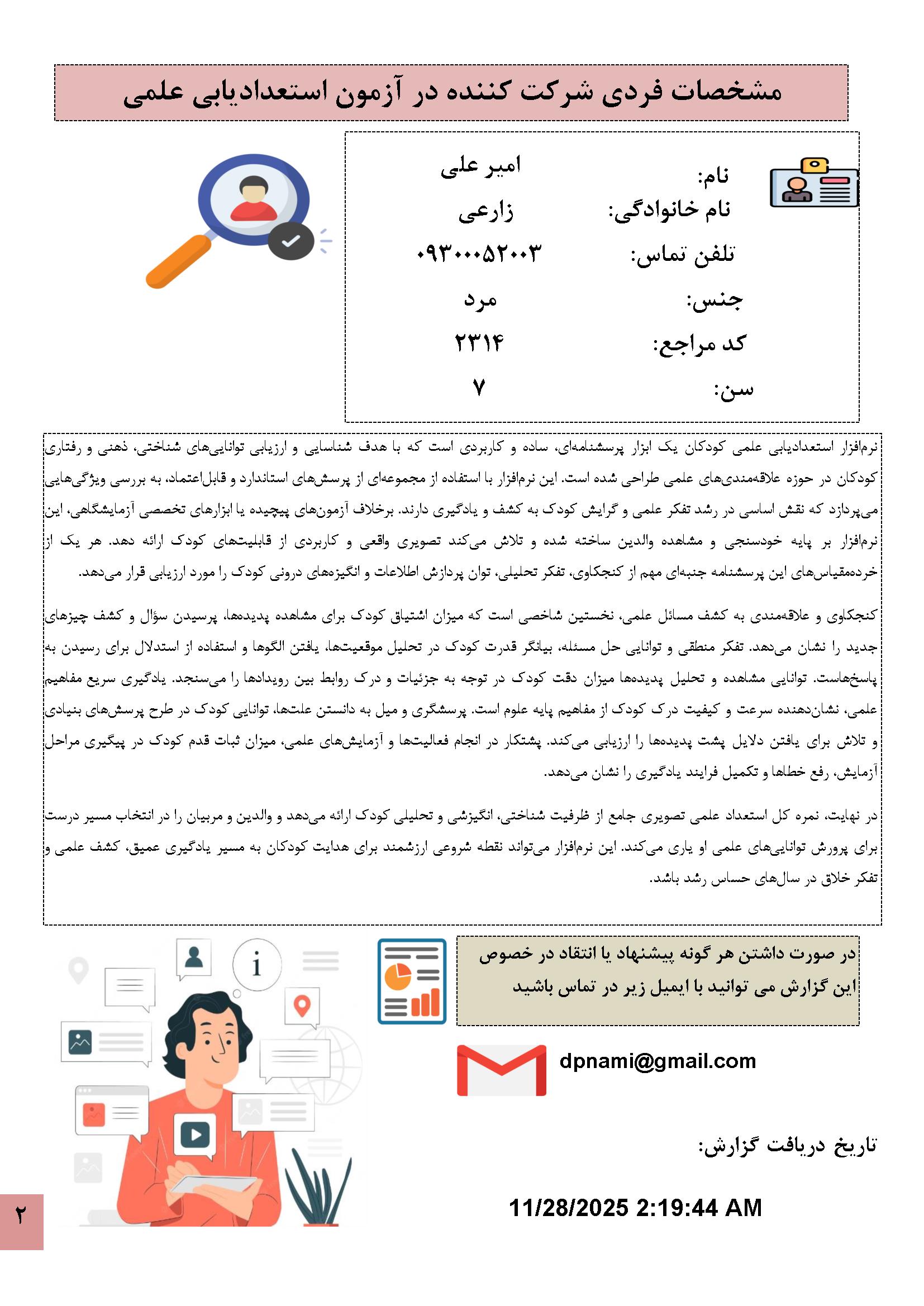 در زیر نمونه خروجی نرمافزار استعدادیابی علمی کودکان آورده شده است