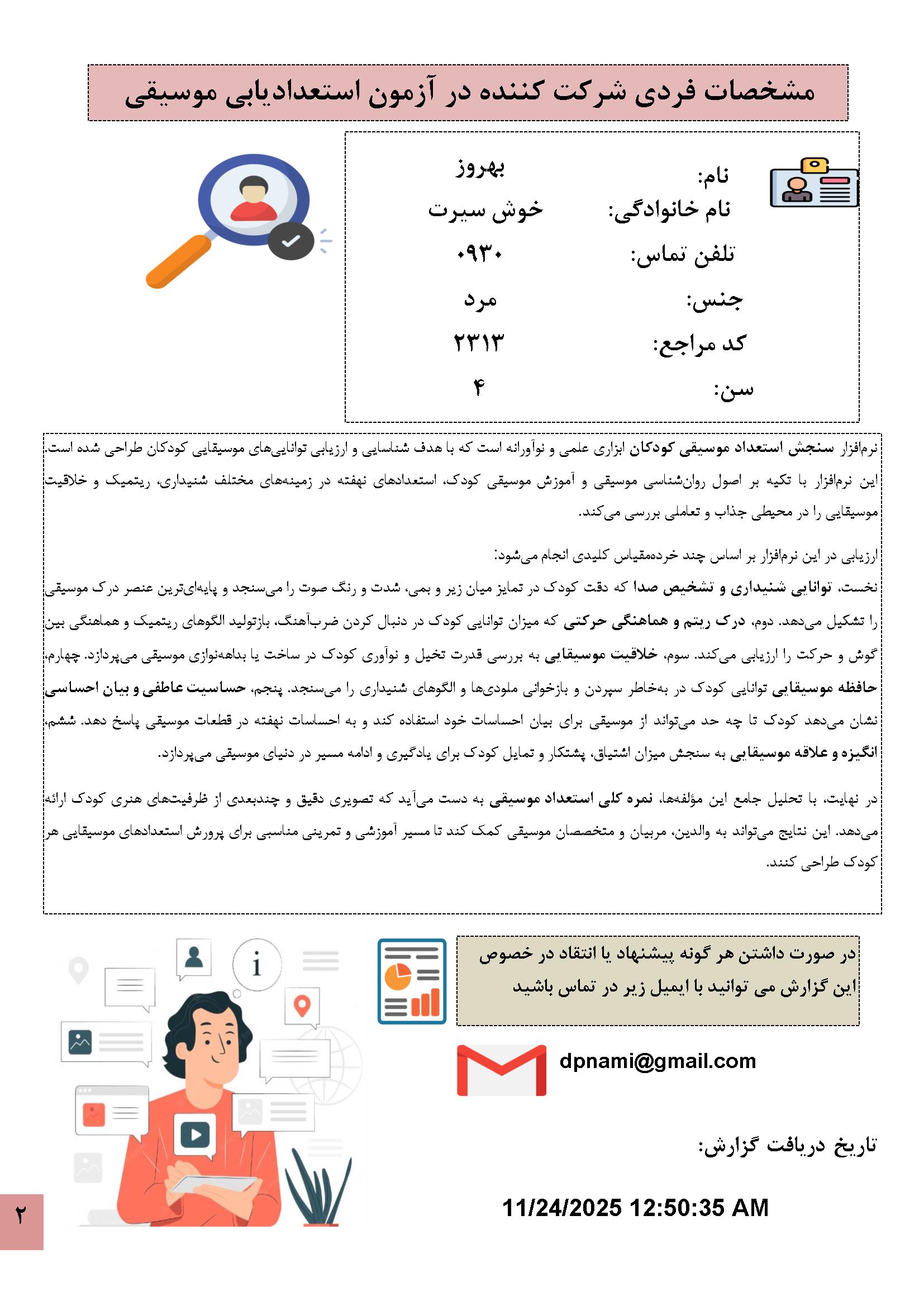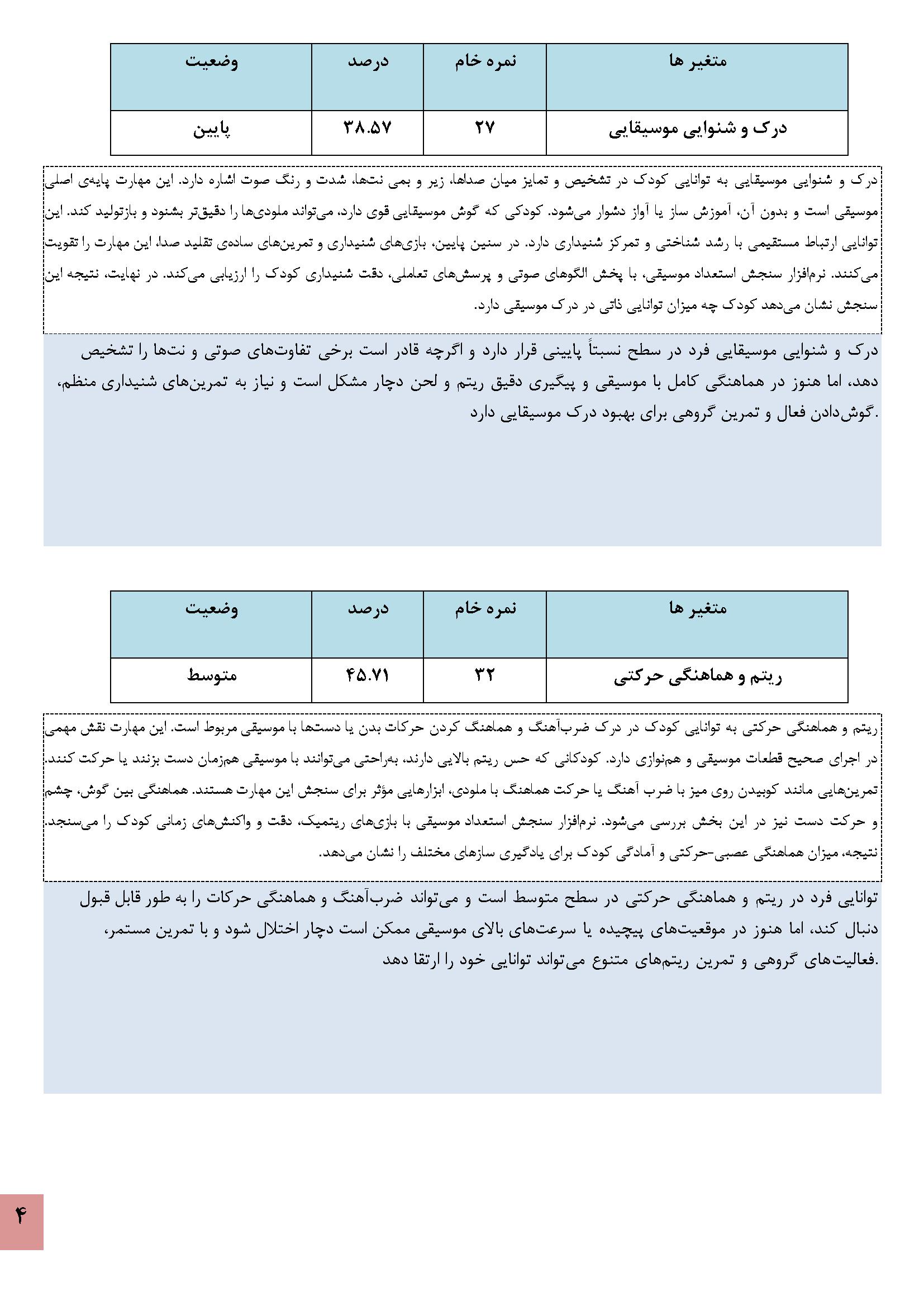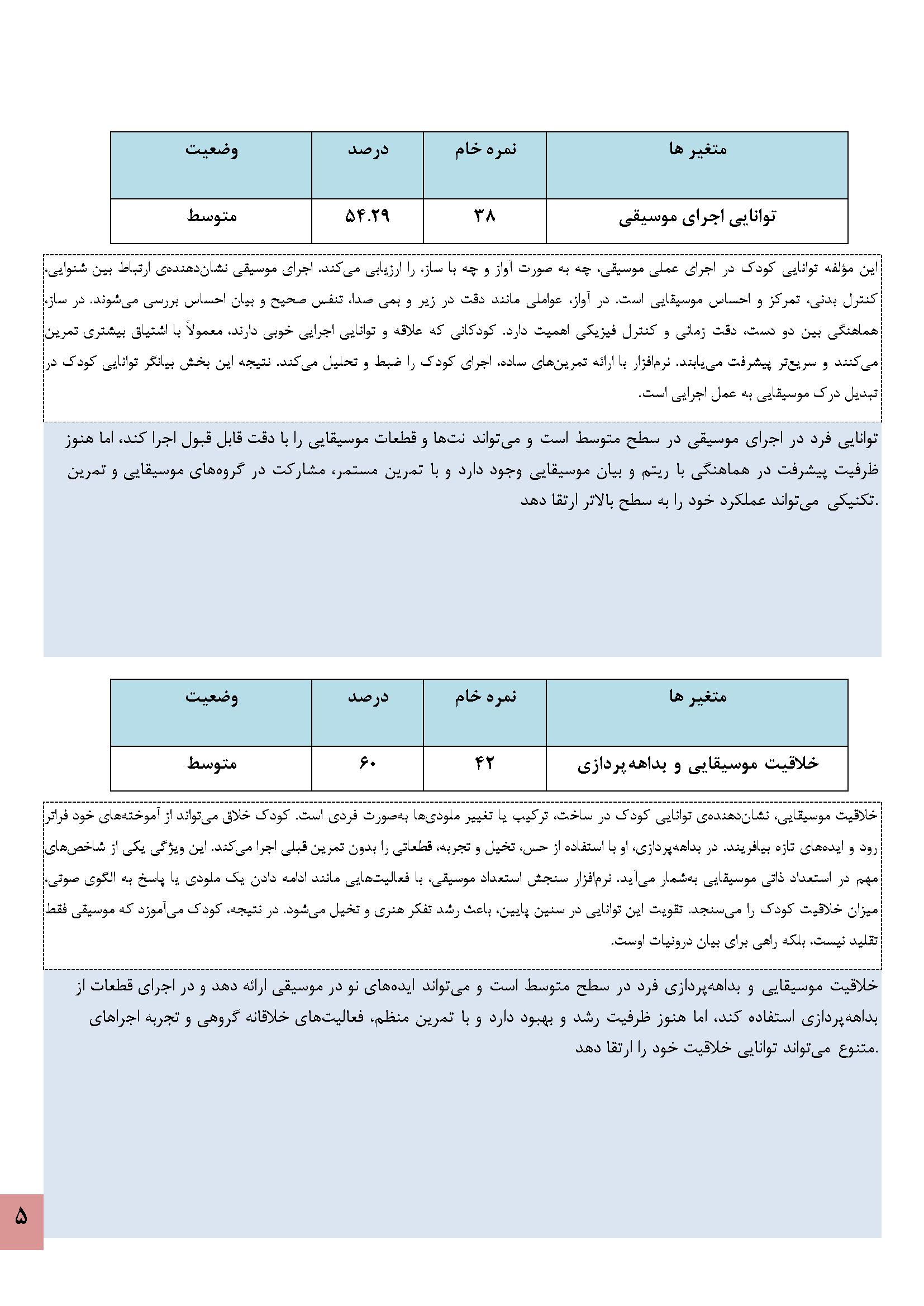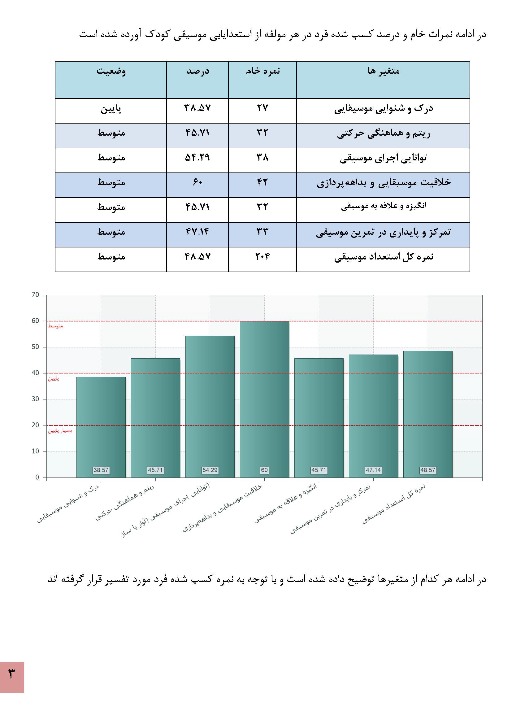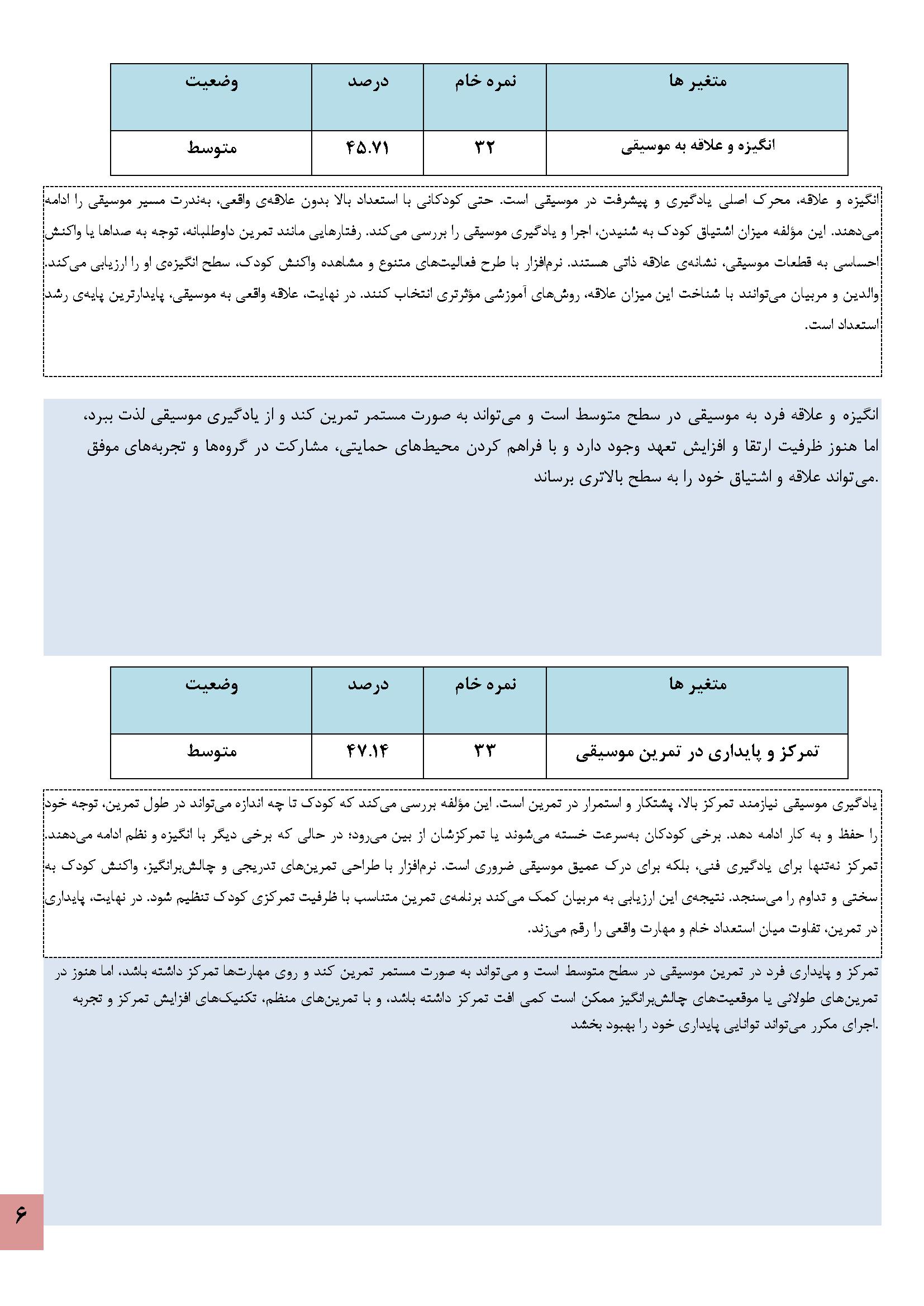 در زیر نمونه خروجی نرمافزار استعدادیابی موسیقی کودکان آورده شده است