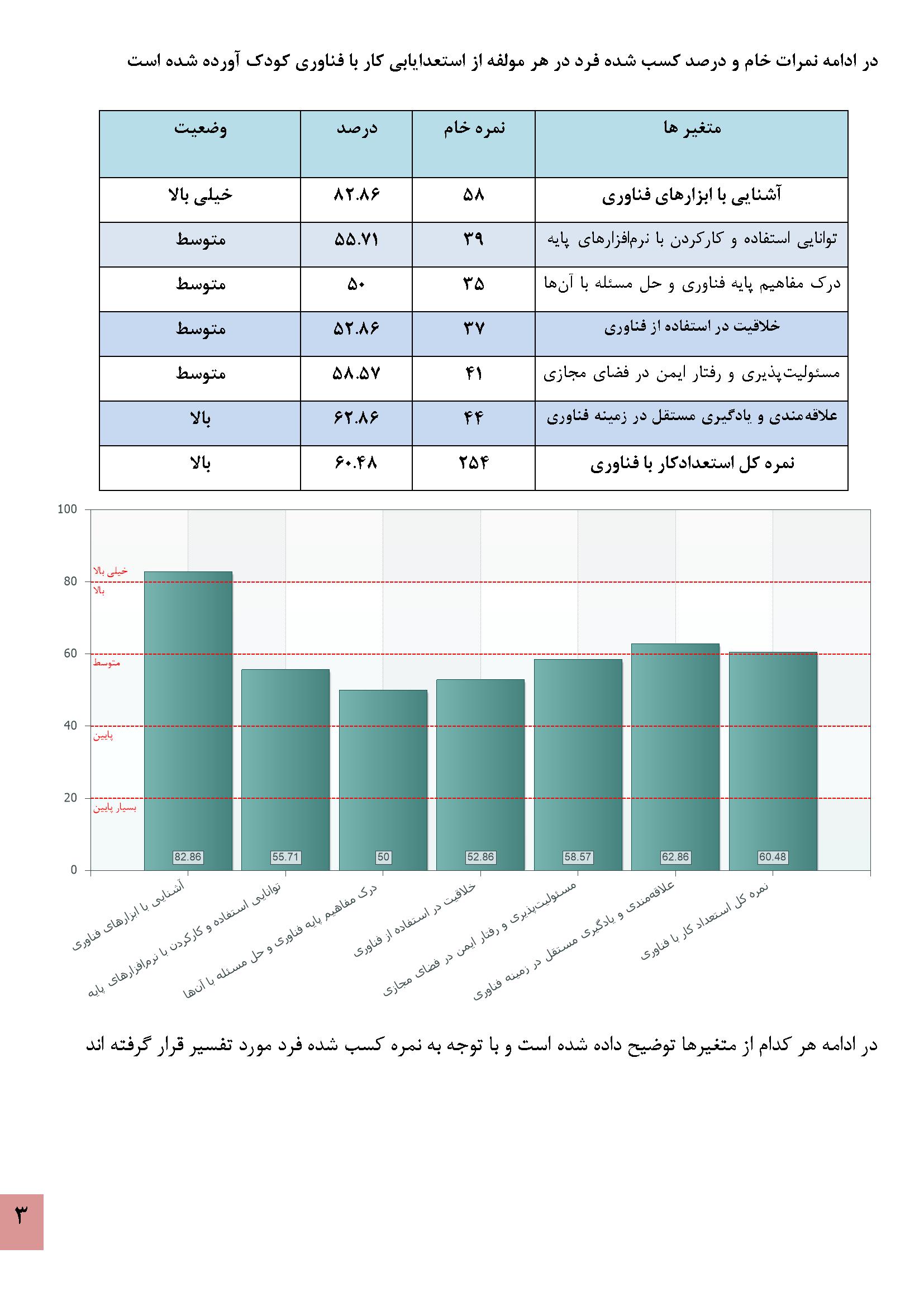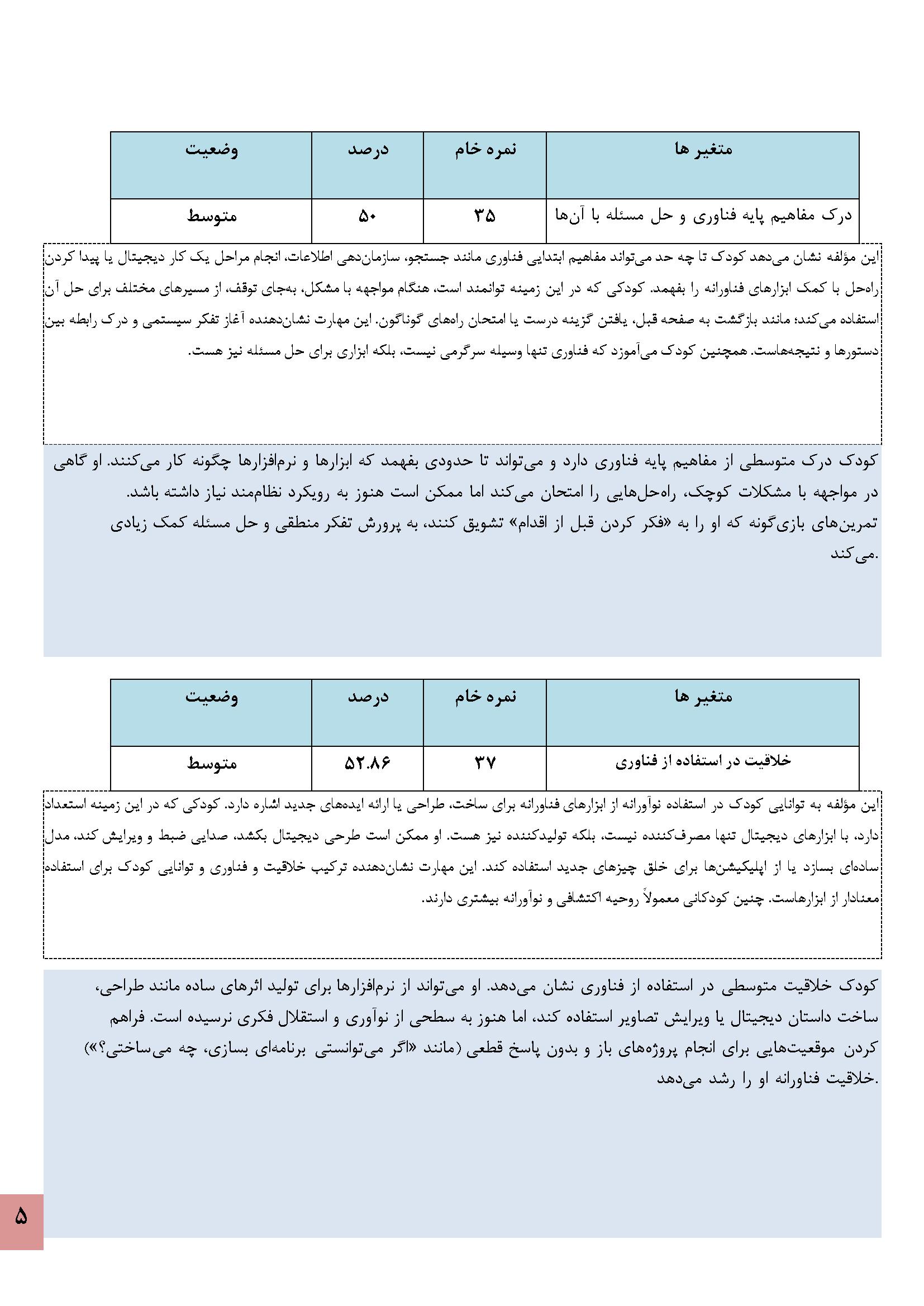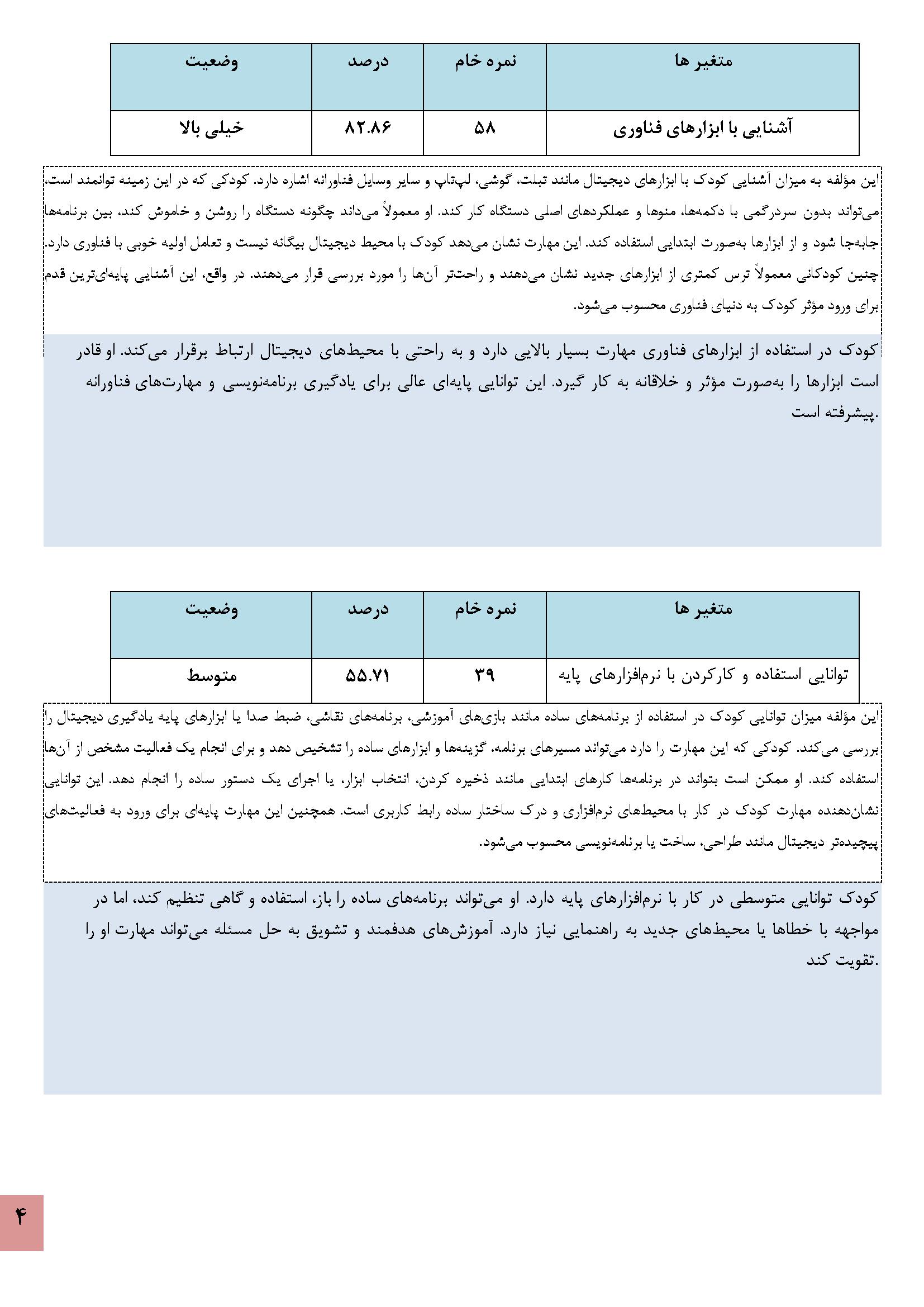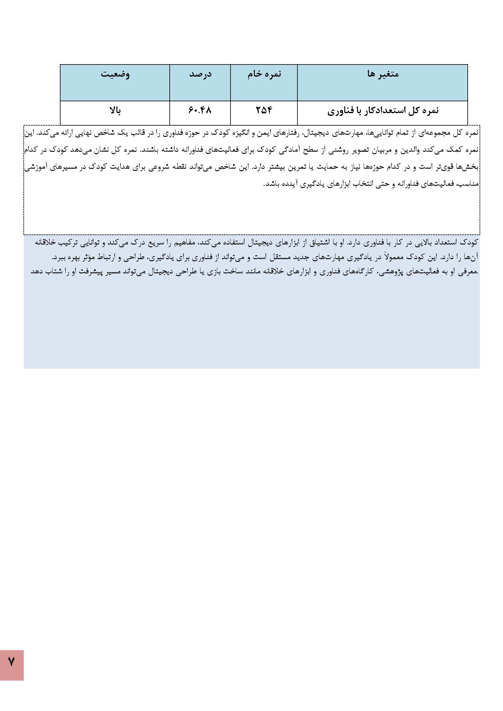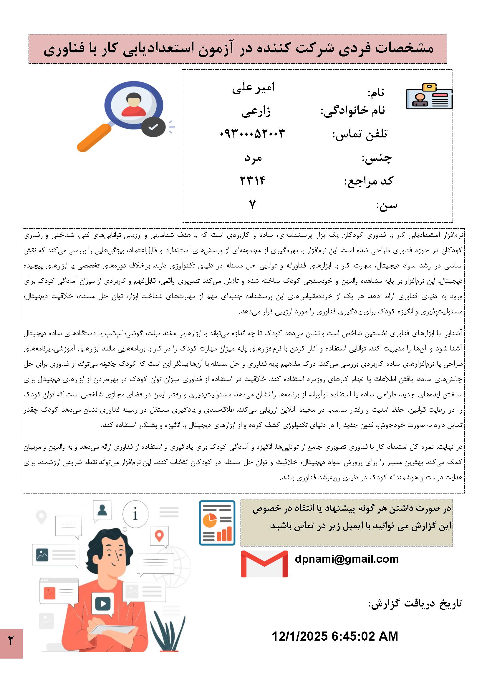 در زیر نمونه خروجی ننرمافزار استعدادیابی کار با فناوری کودکان آورده شده است