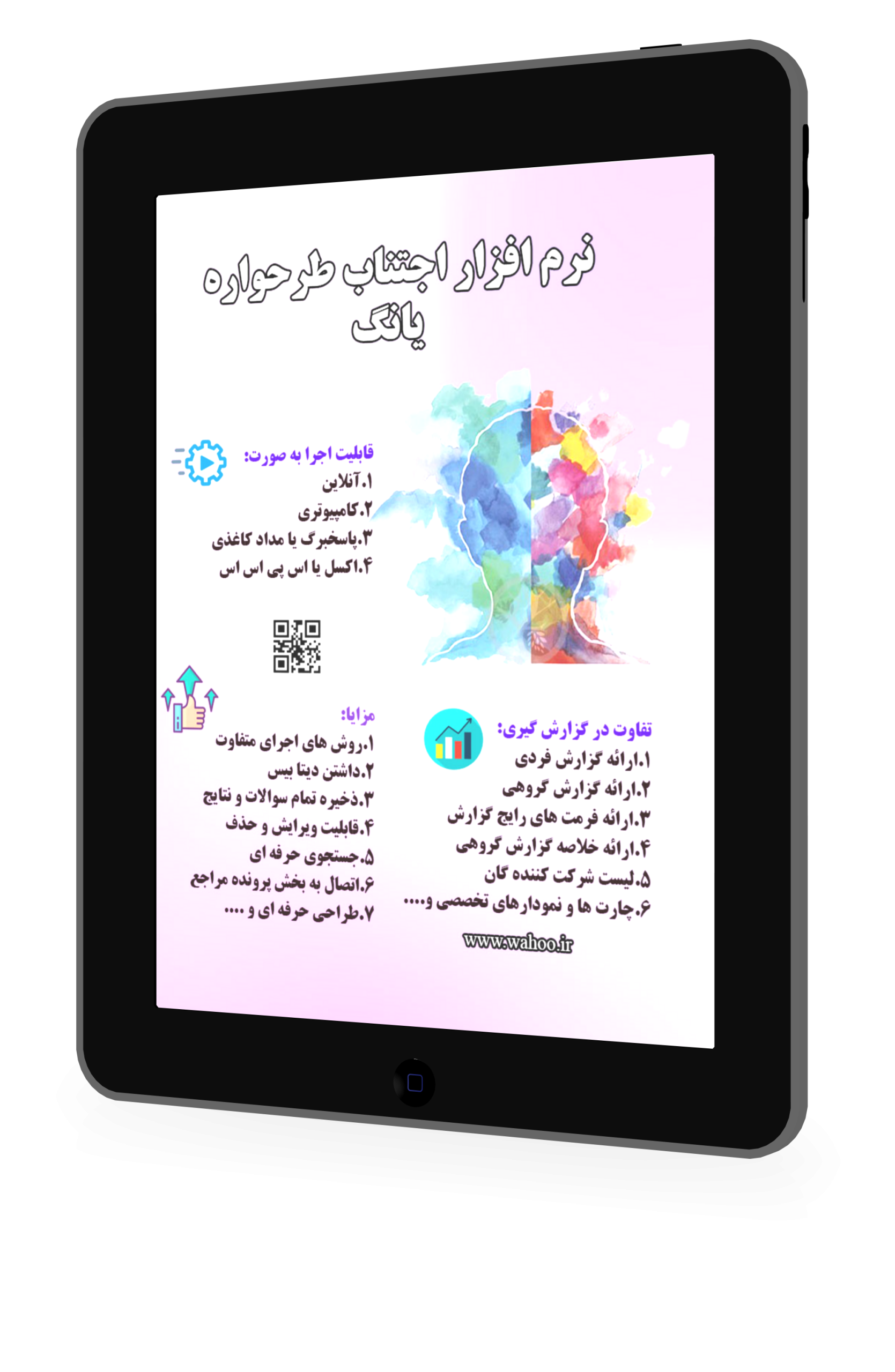 از دیگر ویژگی های نرم افزارهای روانشناسی ما مدیریت آسان داده ها و بررسی سریع مشکلات مراجعین می باشد پس با خیال راحت این نرم افزار ها را در کلنیک خود مورد استفاده قرار دهید. نمونه بروشور آزمون های روانشناسی ما را می توانید از اینجا دانلود کنید.