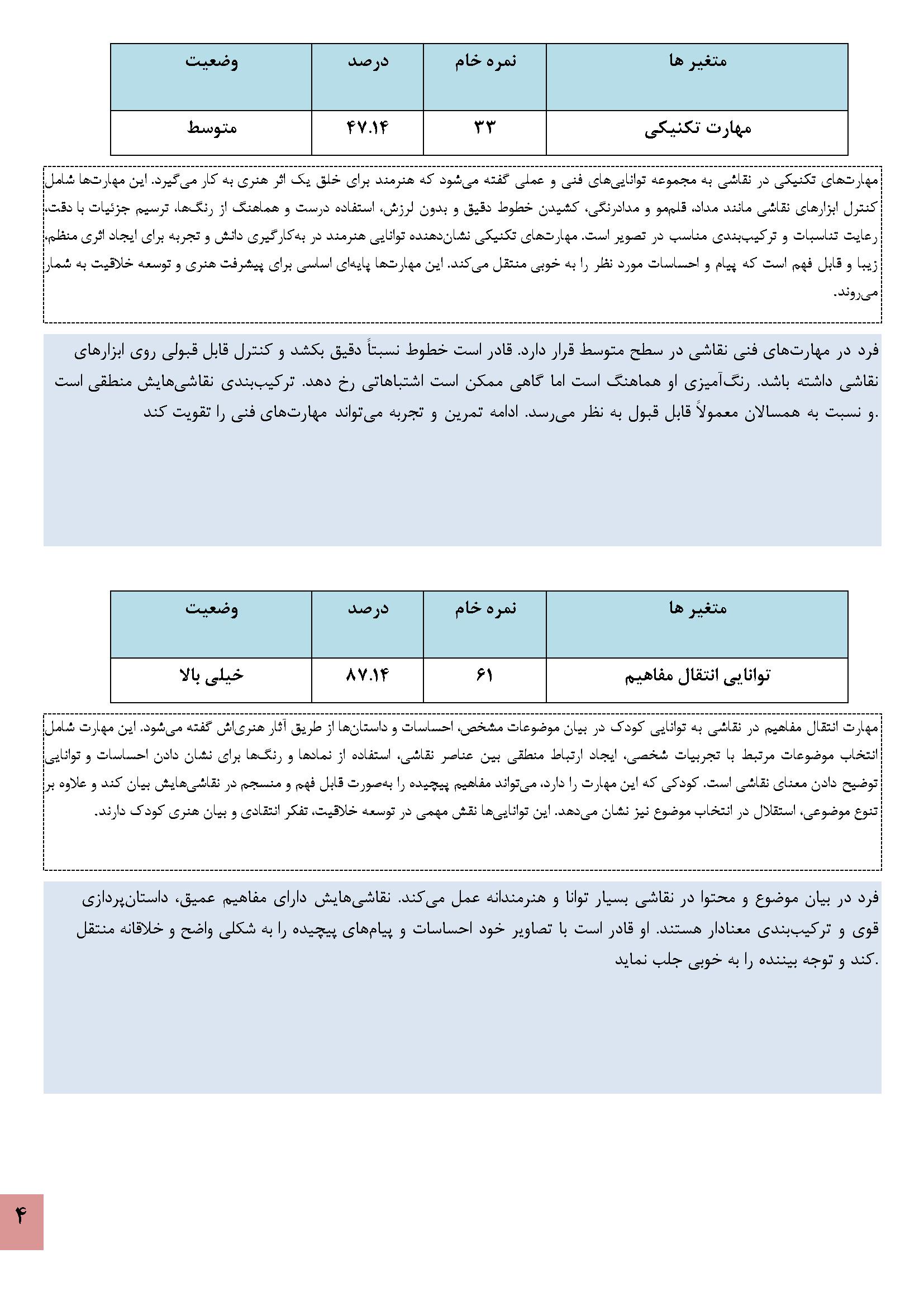 در پایان آزمون، نرم‌افزار به‌صورت خودکار نمره و درصد هر مؤلفه را محاسبه می‌کند، نمره کل استعداد نقاشی را نمایش می‌دهد و تفسیر تحلیلی و روان‌شناختی از نتایج را ارائه می‌دهد.