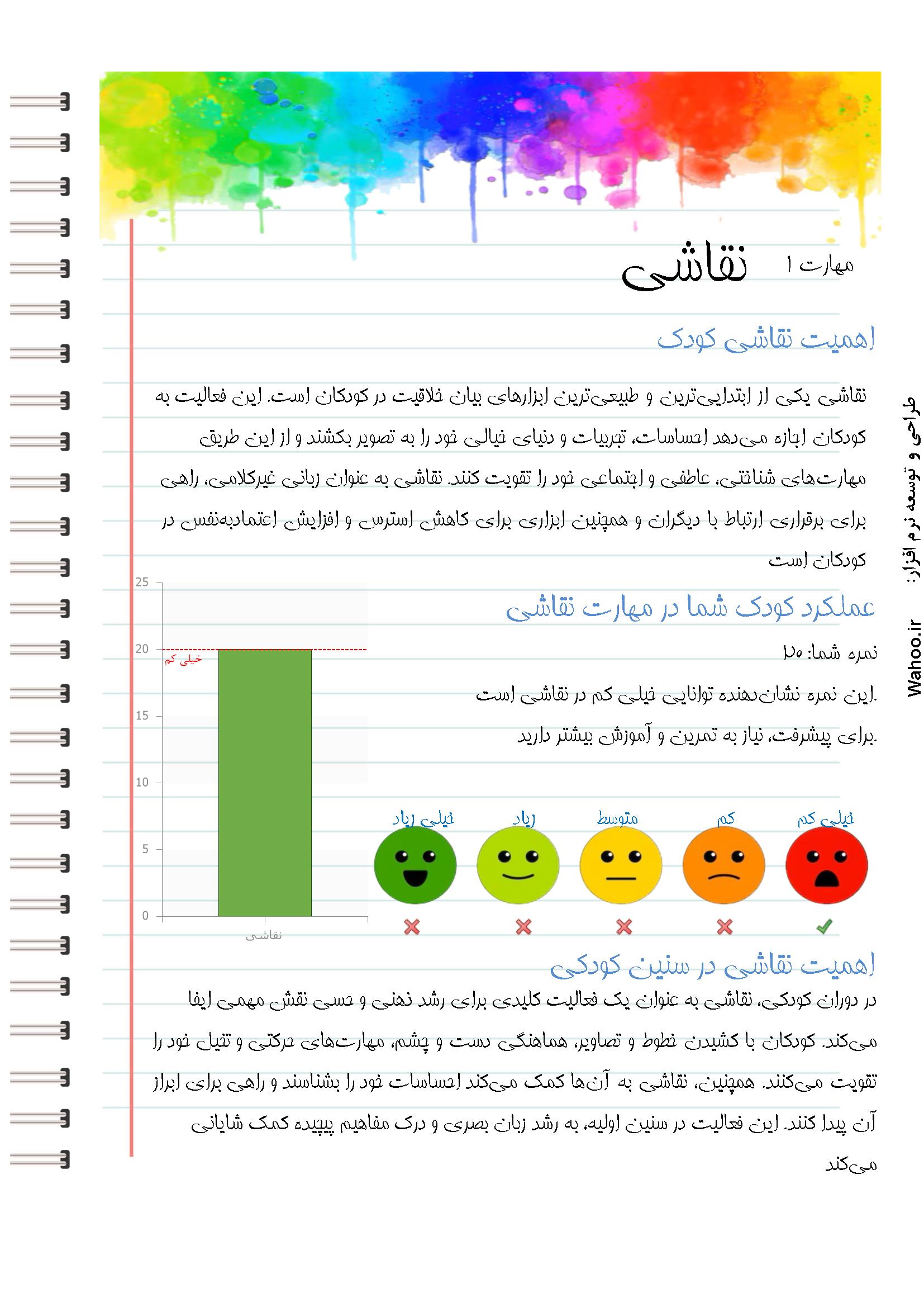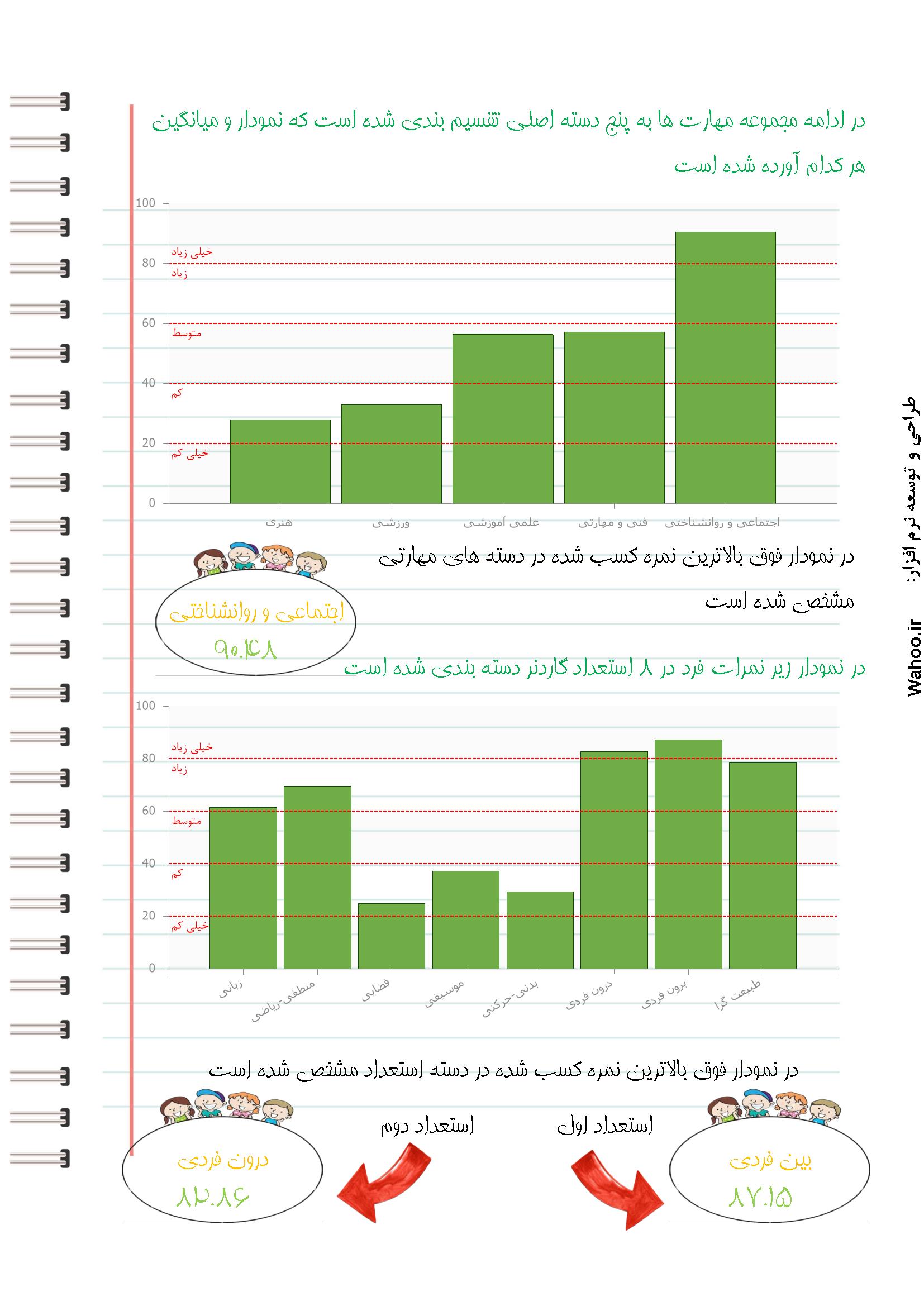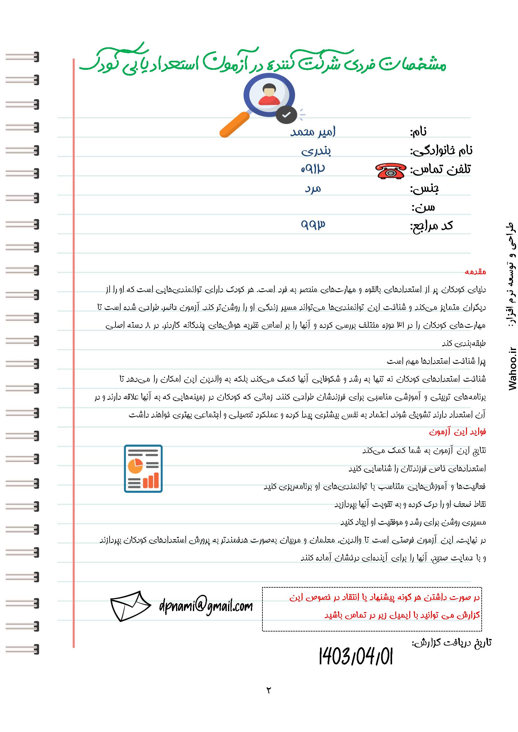 در ادامه نمونه صفحاتی از گزارش نرم افزار استعداد یابی کودکان آورده شده است. این گزارش به صورت جامع و در 84 صفحه تنظیم شده است
