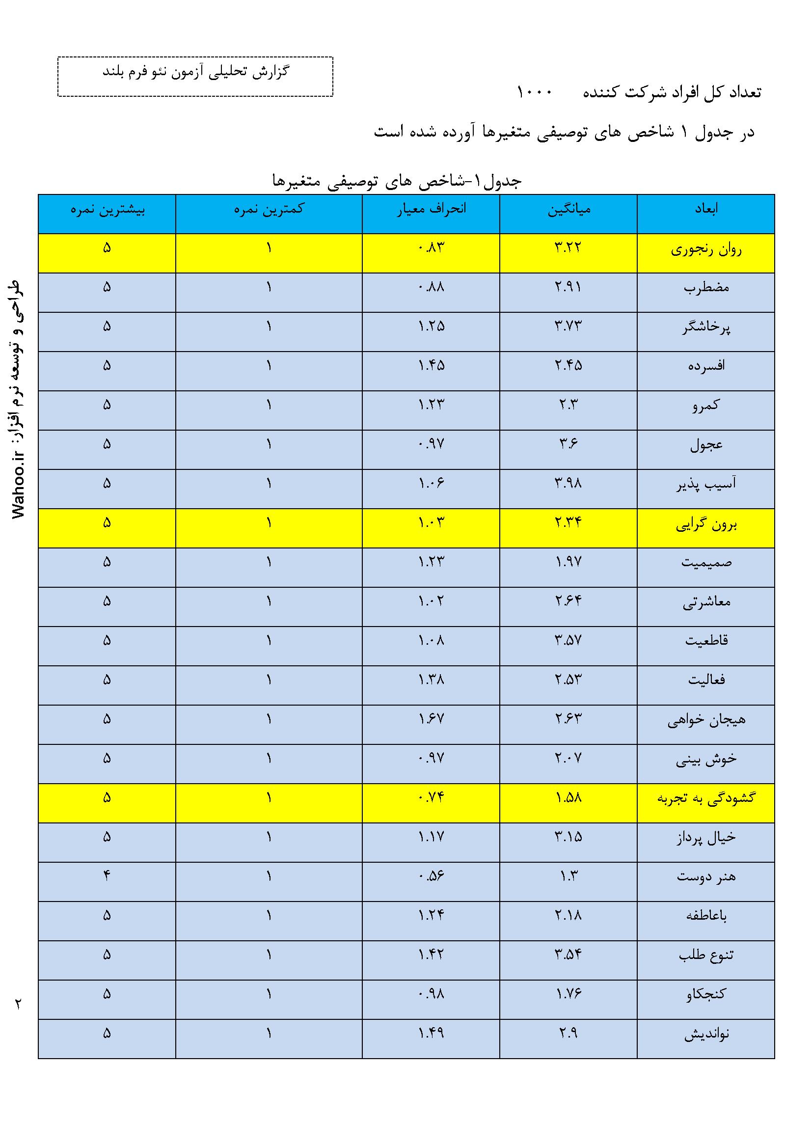 در ادامه نمونه صفحاتی از گزارش تحلیلی نرم افزار نئو فرم بلند آورده شده است. این گزارش به صورت جامعه و در 11 صفحه تنظیم شده است