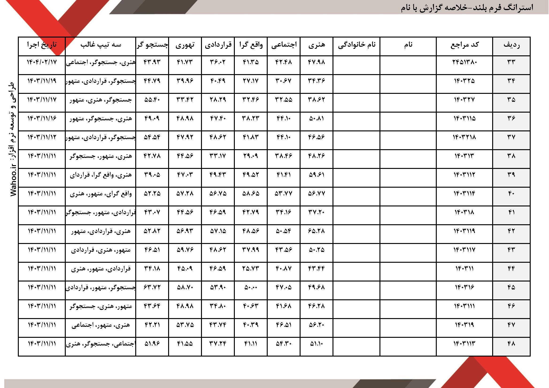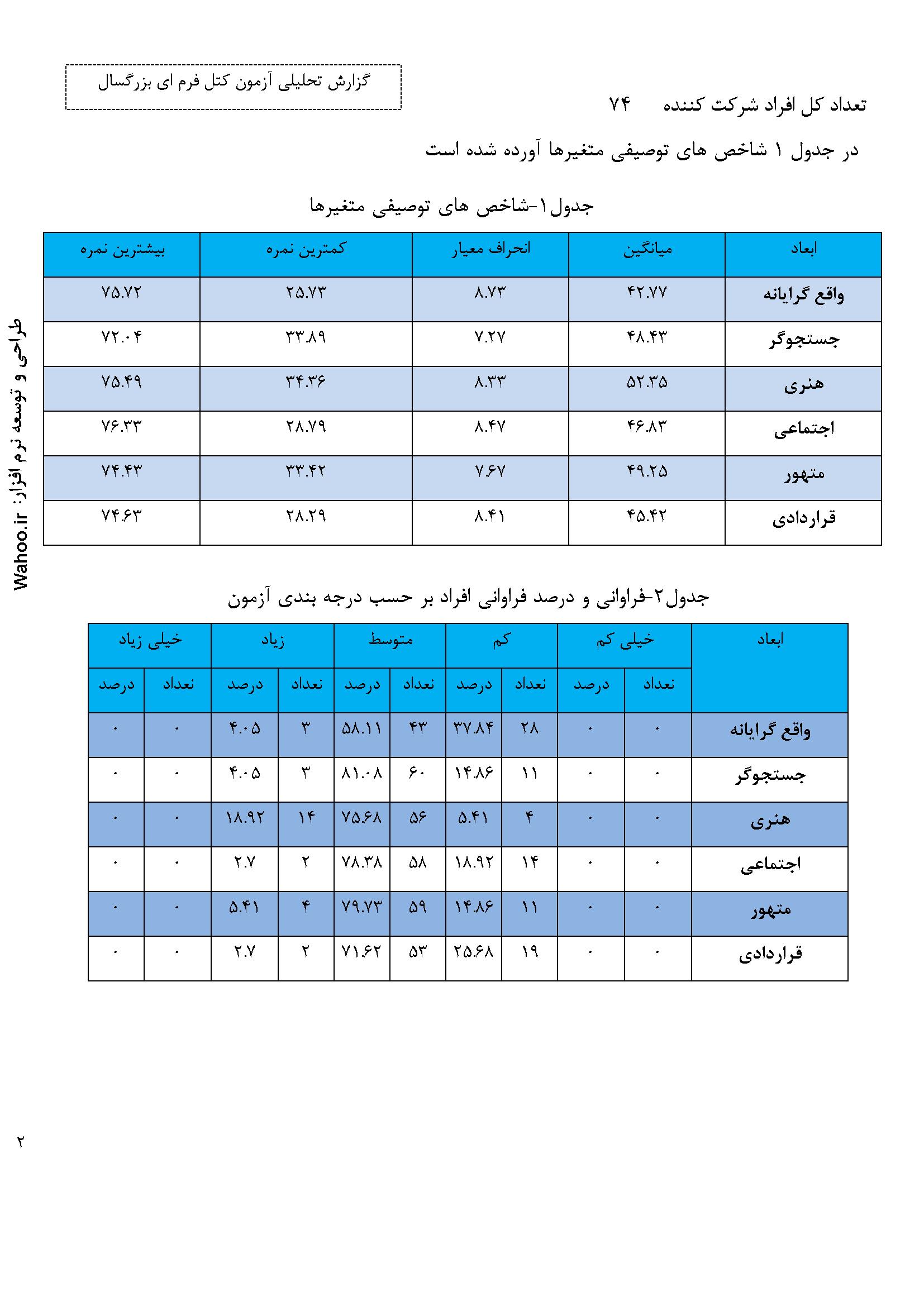 یک صفحه از نمونه گزارش لیستی این آزمون نیز در زیر آورده شده است