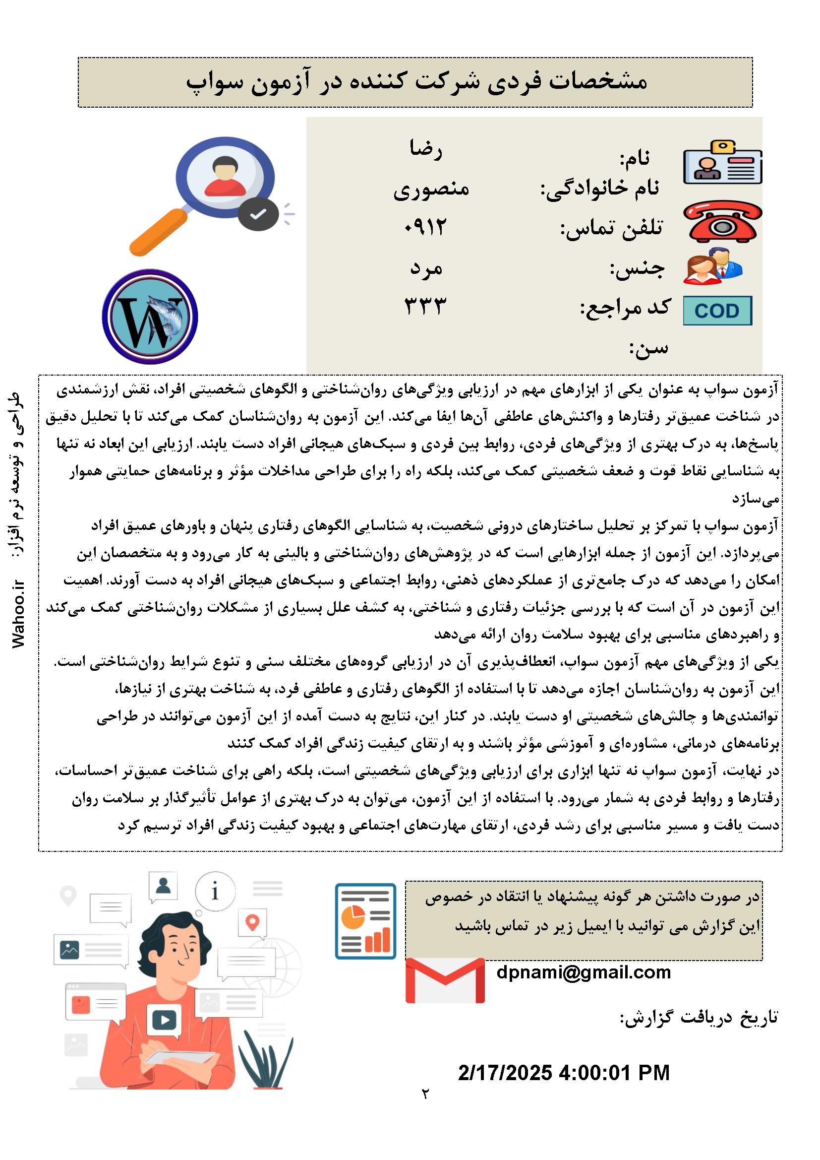 💡 ارزیابی جامع و علمی: نرم‌افزار SWAP-200 بر اساس اصول علمی روان‌شناسی ساخته شده و داده‌ها را با دقت تحلیل می‌کند.