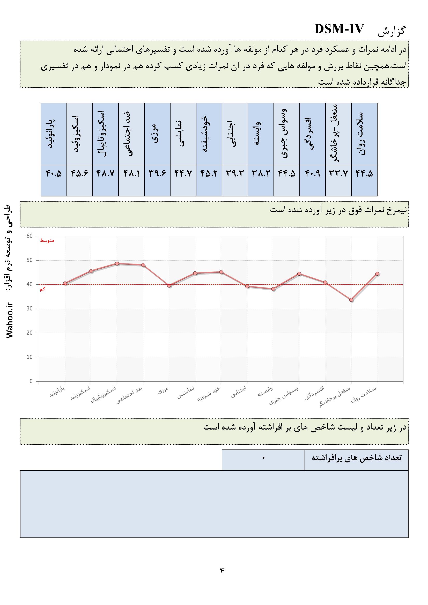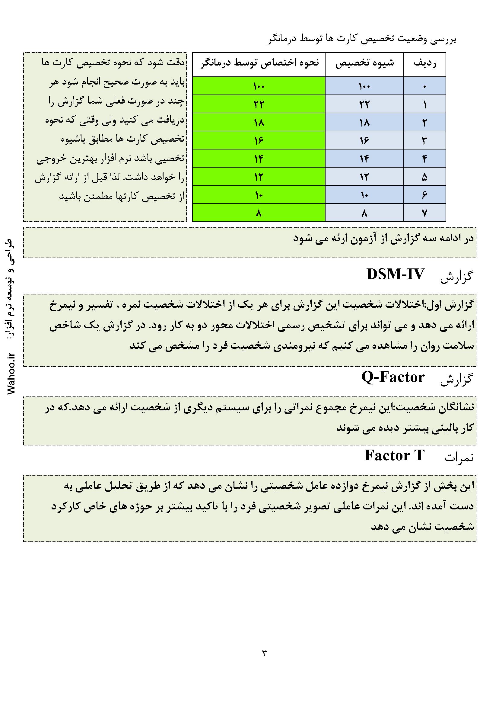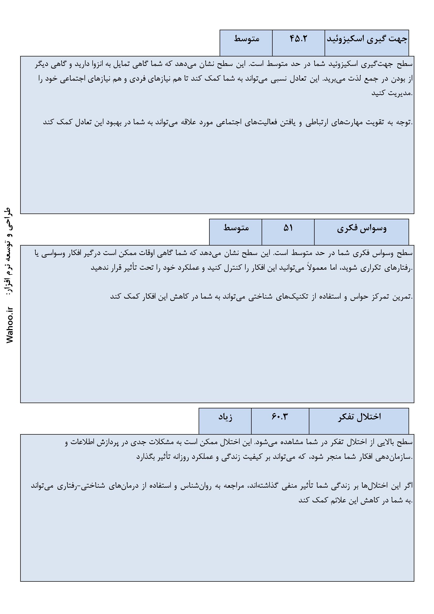 📊 گزارش‌های دقیق و تحلیلی: پس از انجام ارزیابی‌ها، نرم‌افزار گزارش‌هایی جامع و تفصیلی ارائه می‌دهد که شامل نتایج تحلیلی و راهکارهای درمانی برای بهبود وضعیت روانی فرد است.