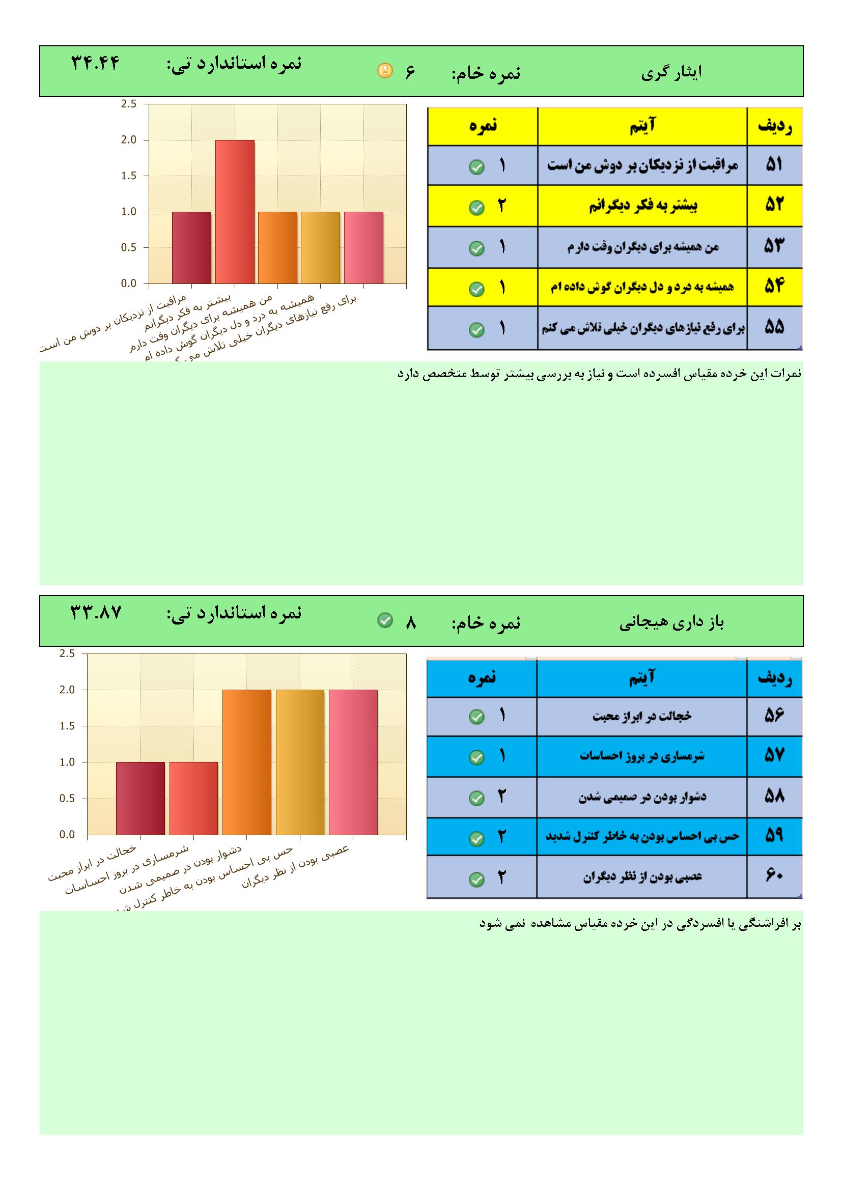 4-پرسشنامه اجتناب طرحوراه است که می توان هر کدام از تست ها را به تنهایی اجرا وتحلیل کنید و در نهایت یک تحلیل تعاملی از سه تست(طرحواره، جبران،اجتناب) نیز داشته باشید و نیمرخ سه تست را بر روی یک نمودار داشته باشید. نمونه عکس هایی از خروجی نرم افزار را می توانید مشاهده کنید